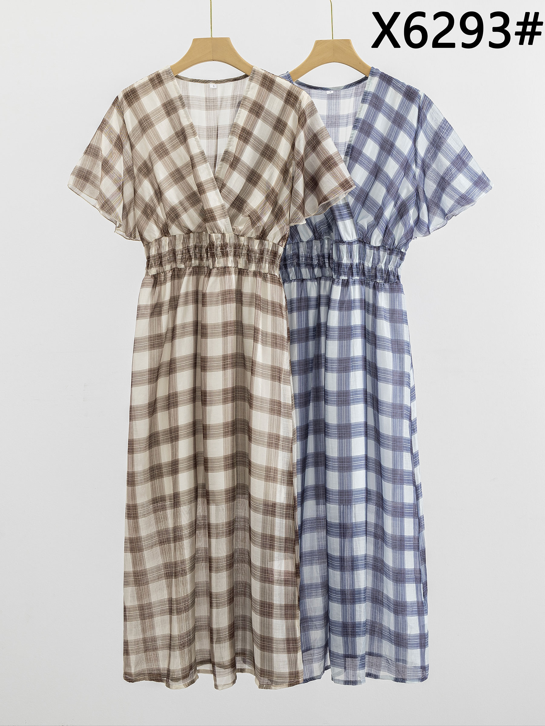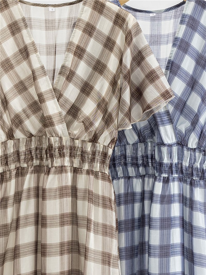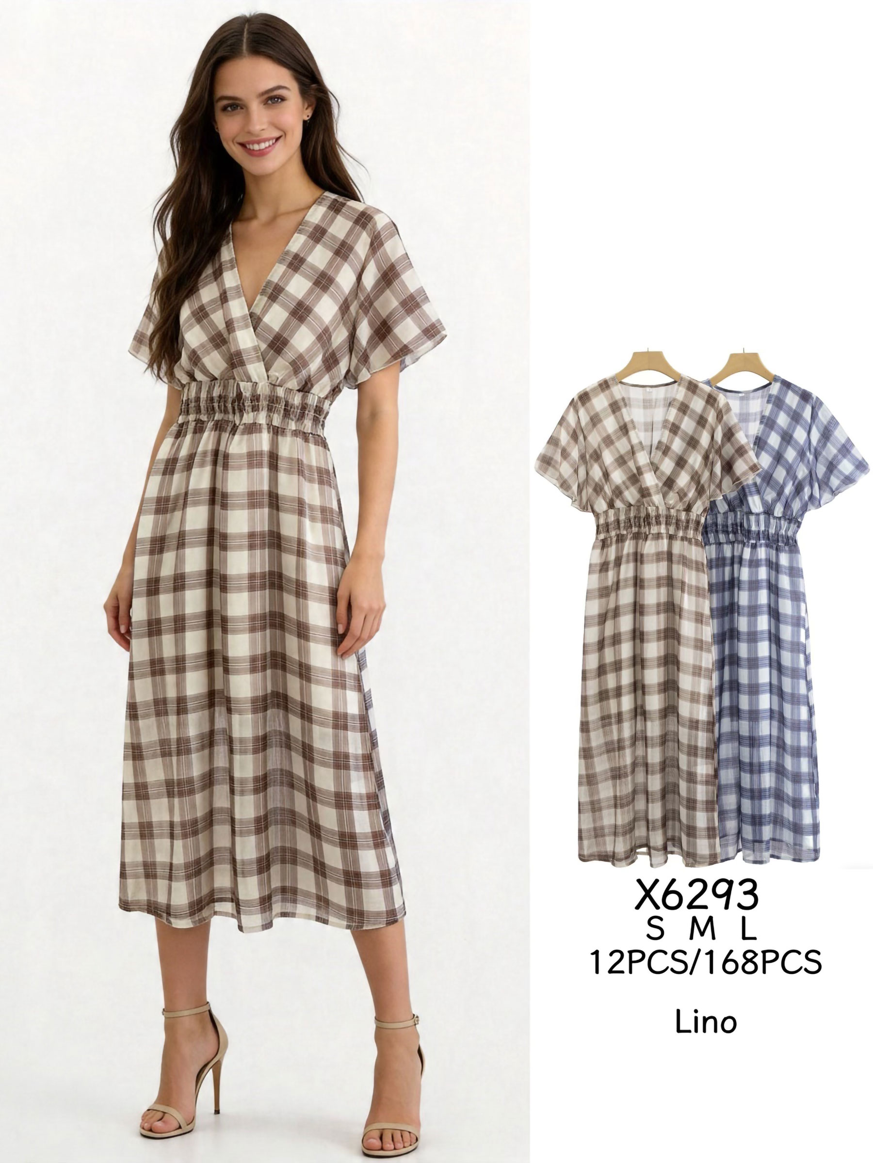 Vestido midi de lino. Estampado de cuadros. Escote cruzado. Manga corta. Cintura elástica.