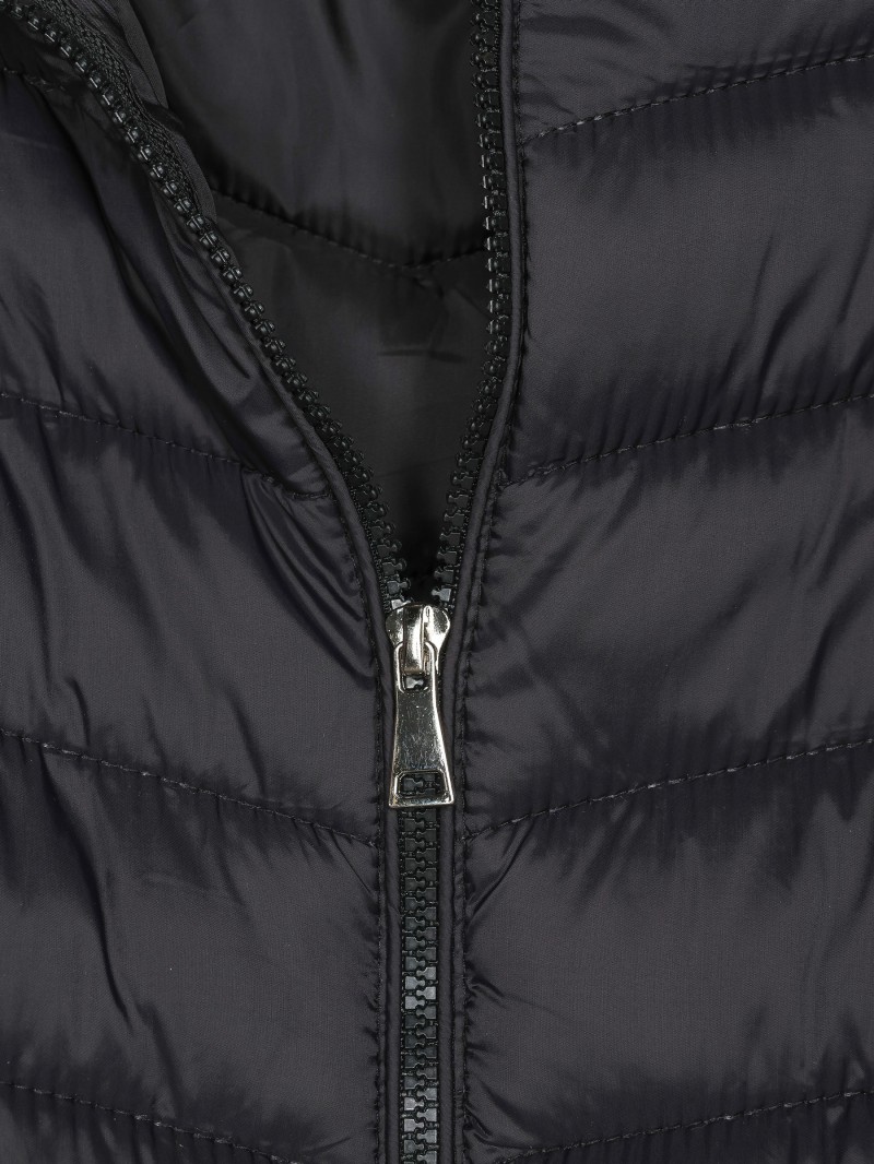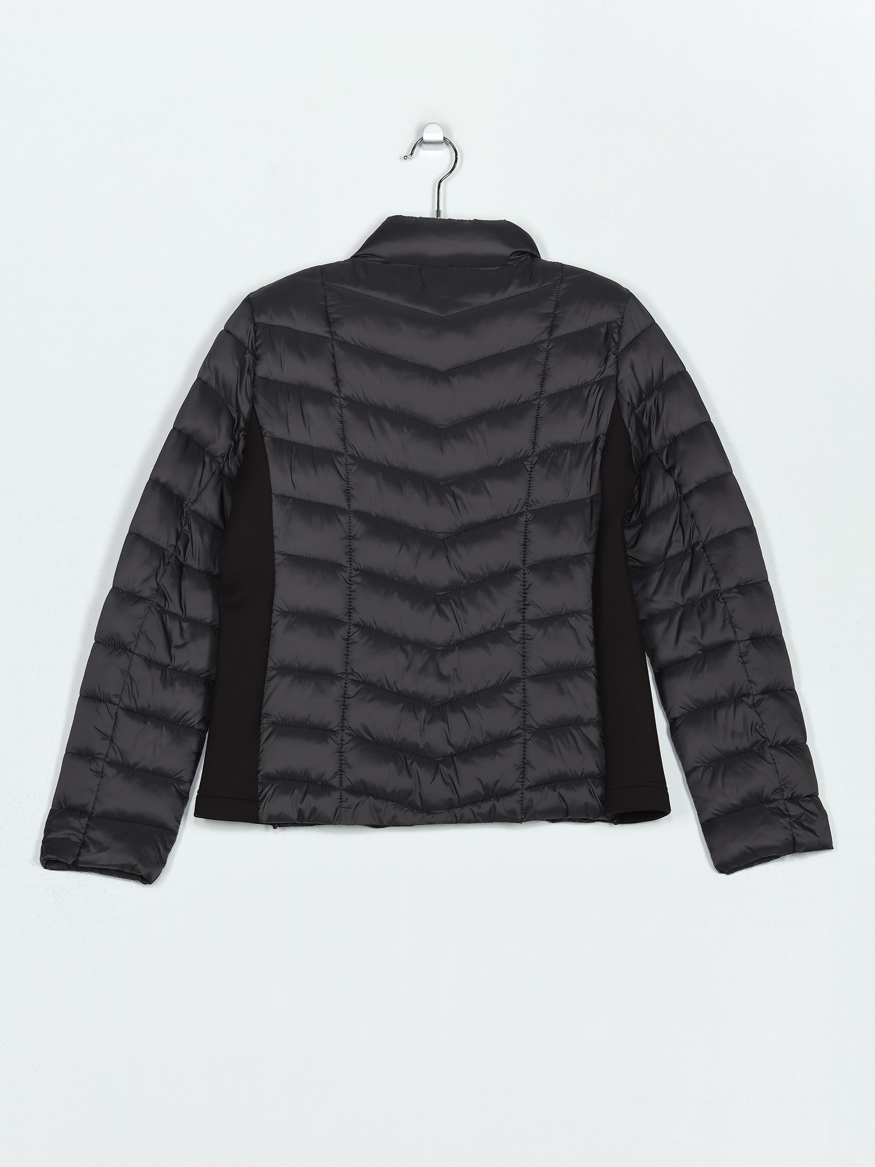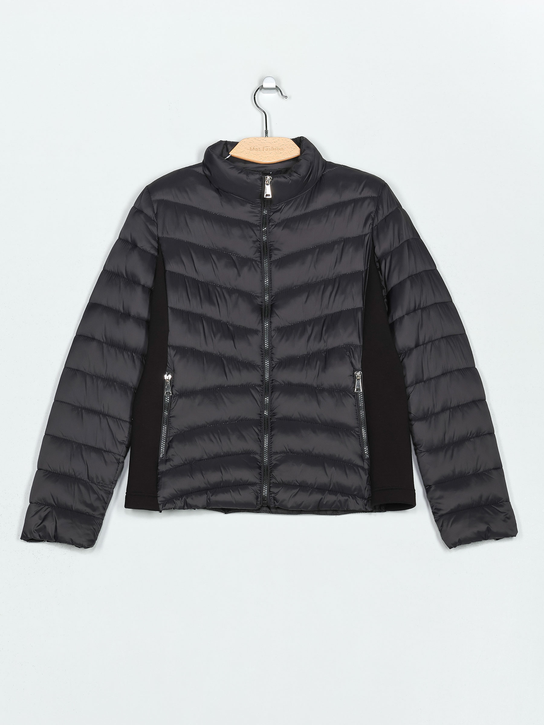 Veste courte ultra légère. Matelassée. Détail de bande élastique assortie. Poches latérales avec fermetures éclair. Col montant. Manches longues. Fermeture éclair centrale.