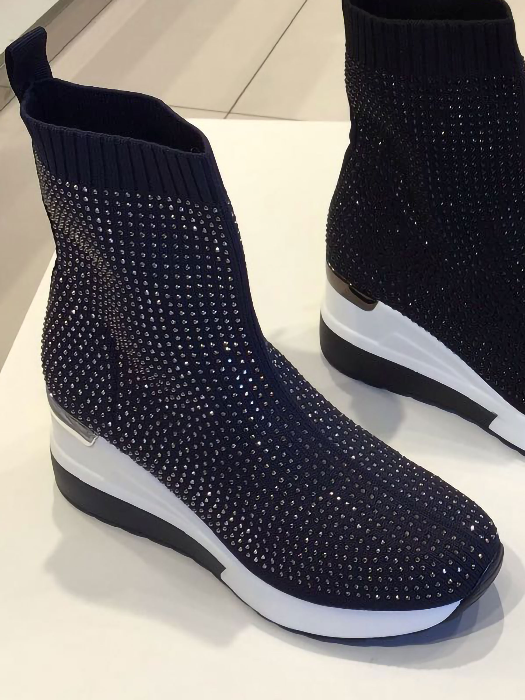 Botte de sport en maille élastique avec des applications de strass et un talon compensé intégré, une tirette à l'arrière et une semelle en caoutchouc bicolore.