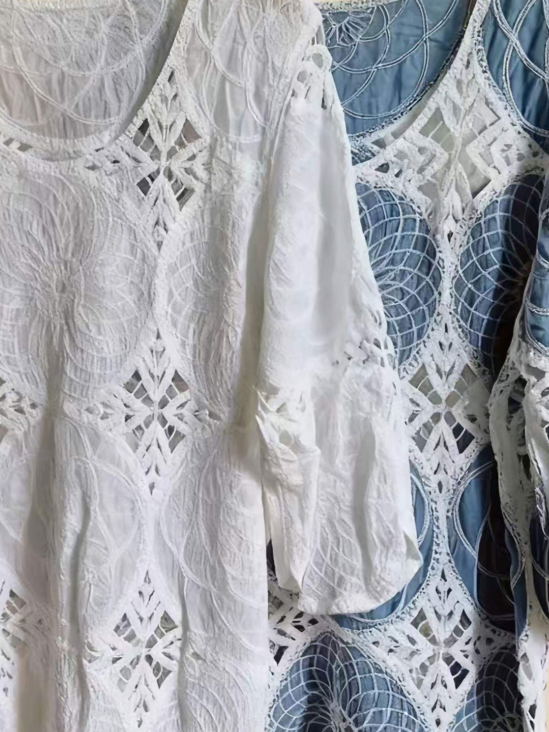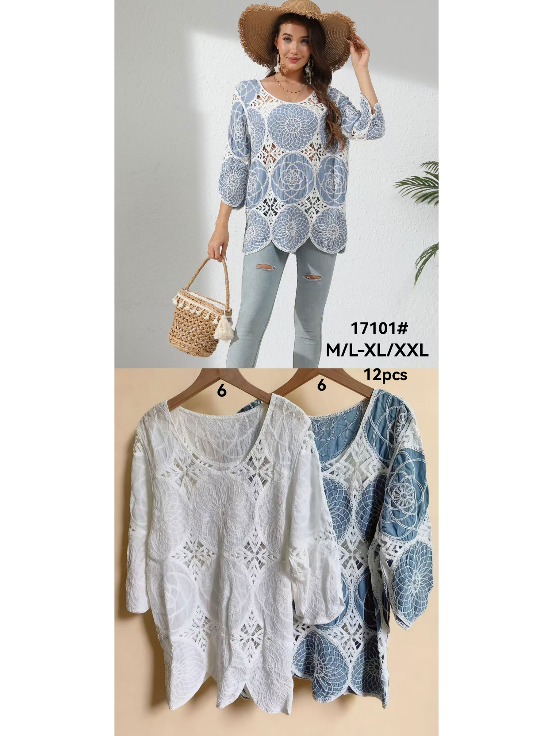 Blouse en dentelle ajourée. Col rond. Manches trois quarts. Ourlet festonné.