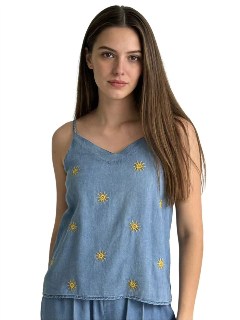 Haut en denim délavé brodé à motif soleil