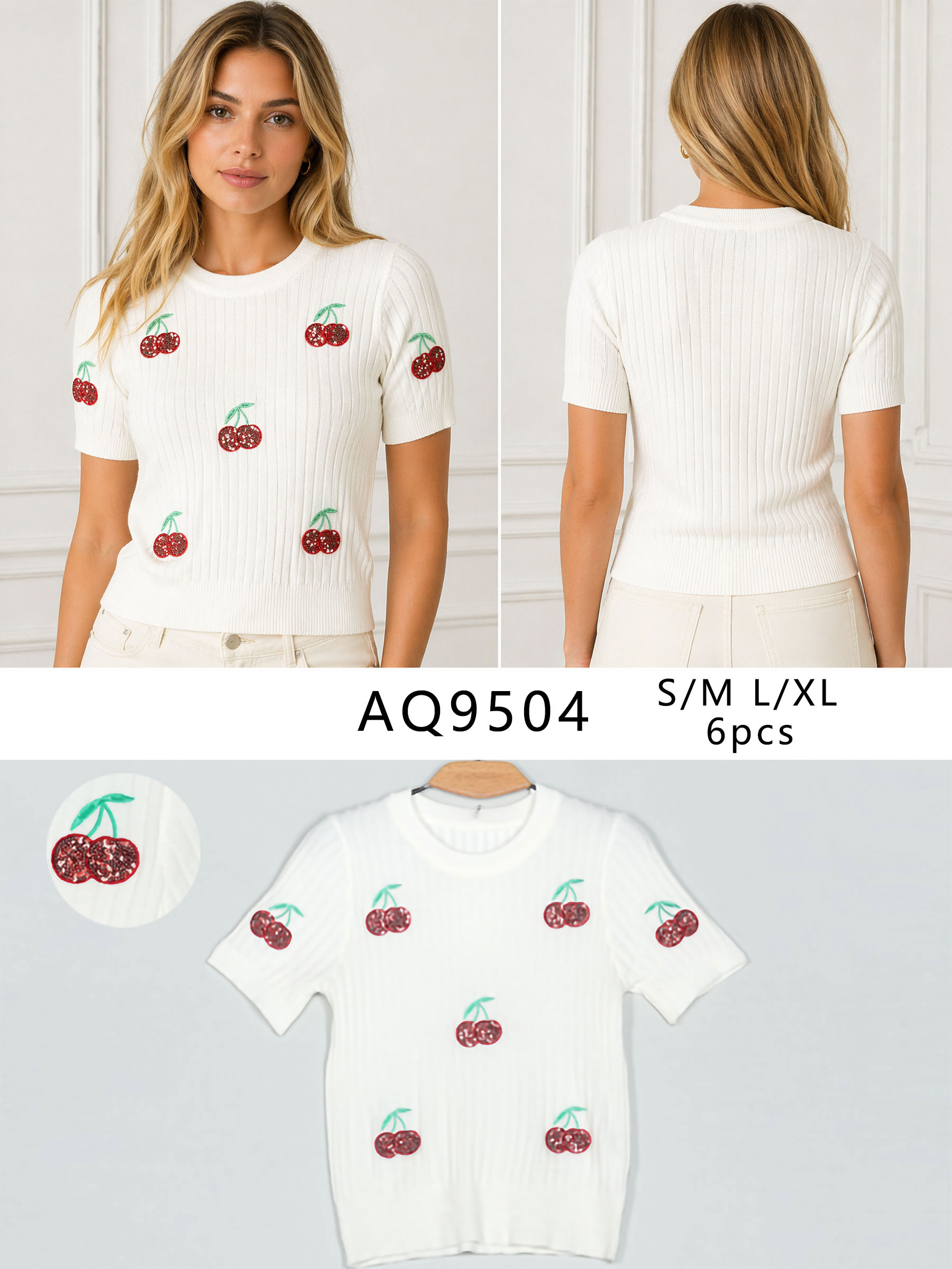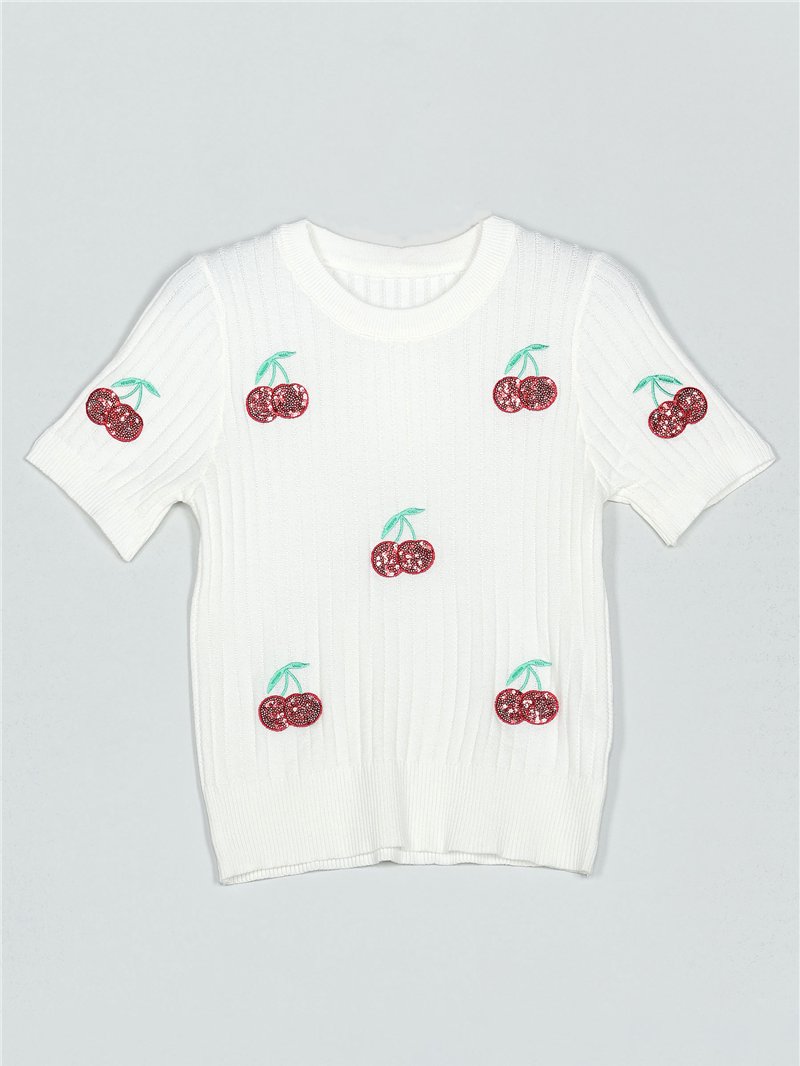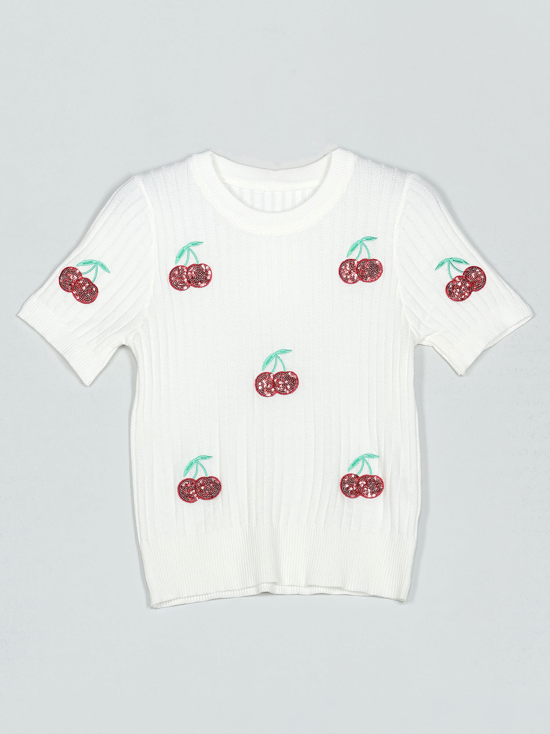 Top en maille côtelée. Détail cerise brodée de sequins. Col rond. Manches courtes.