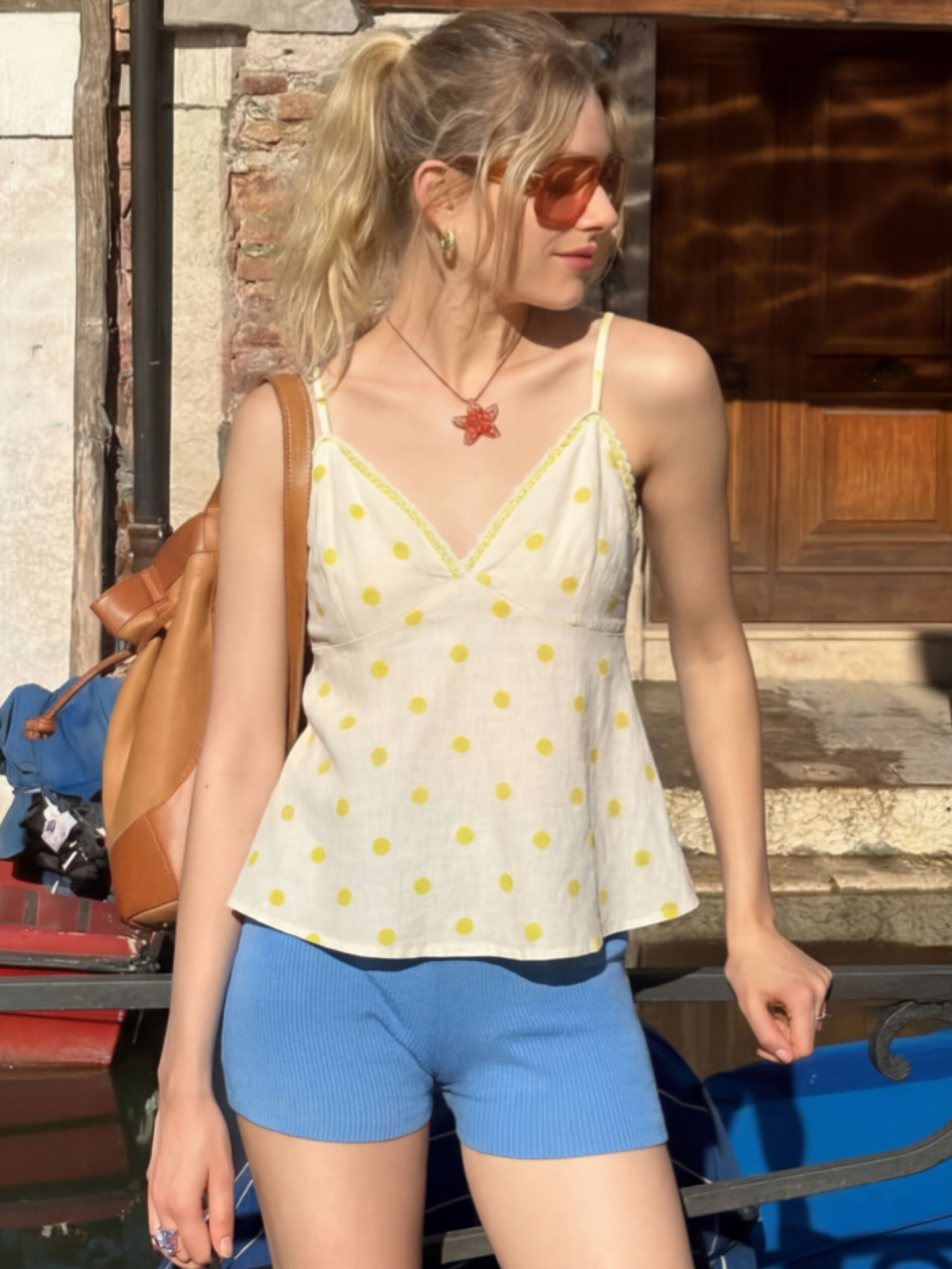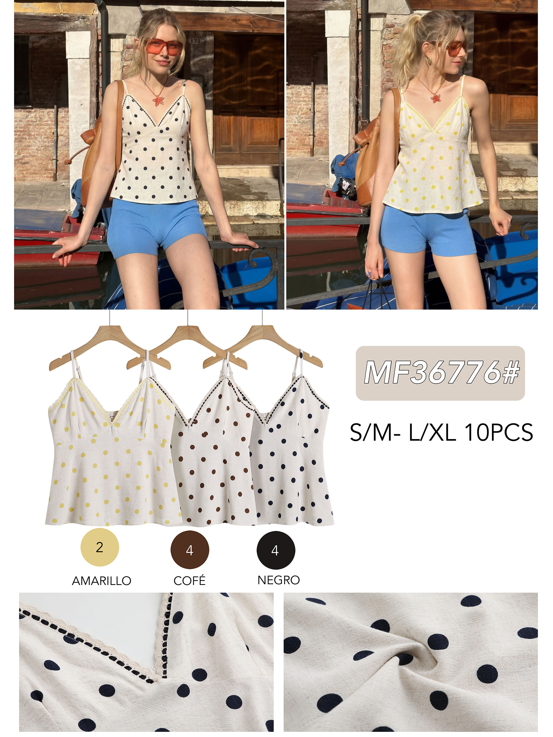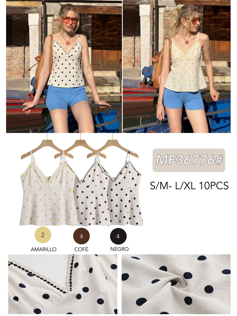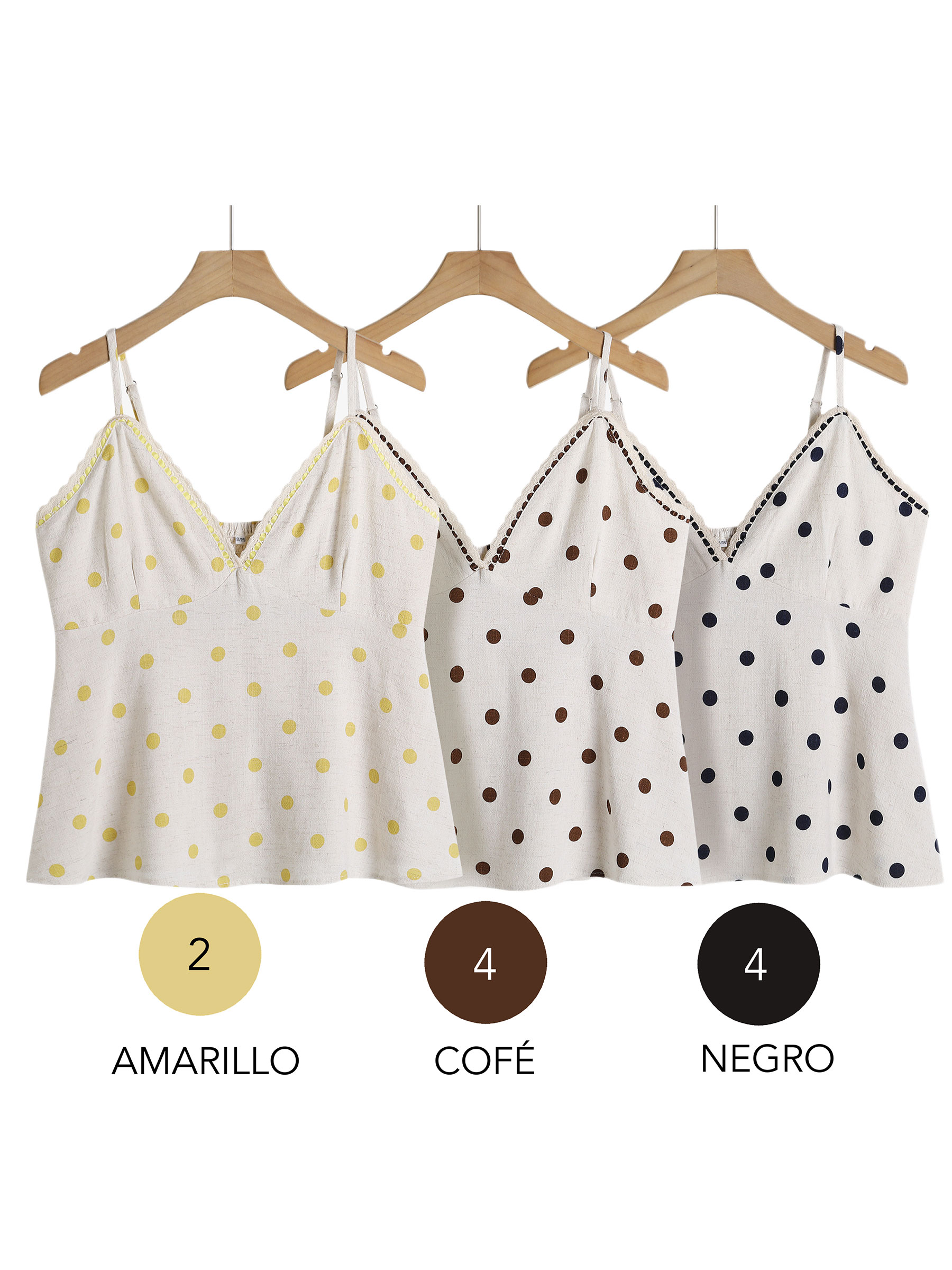 Top à pois. Col en V. Fines bretelles. Détails de finitions contrastées. Tissu effet lin.