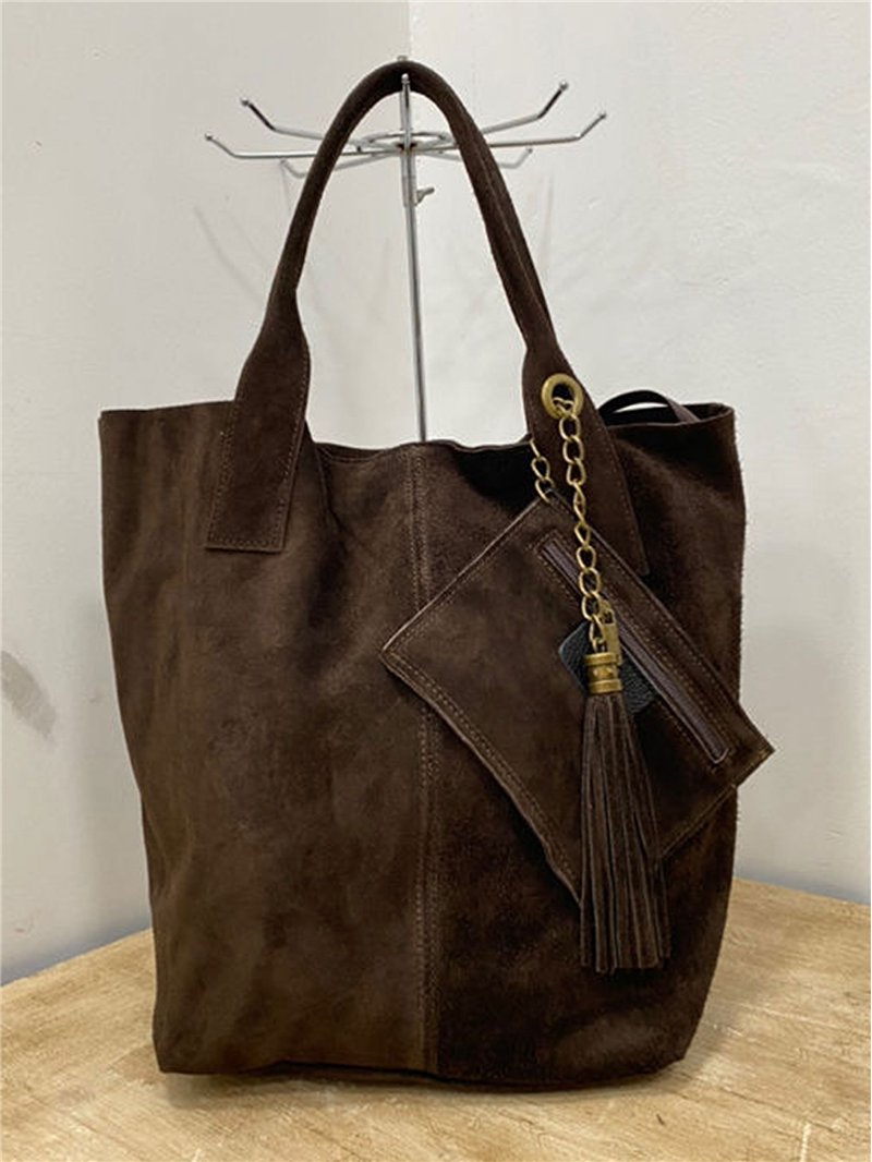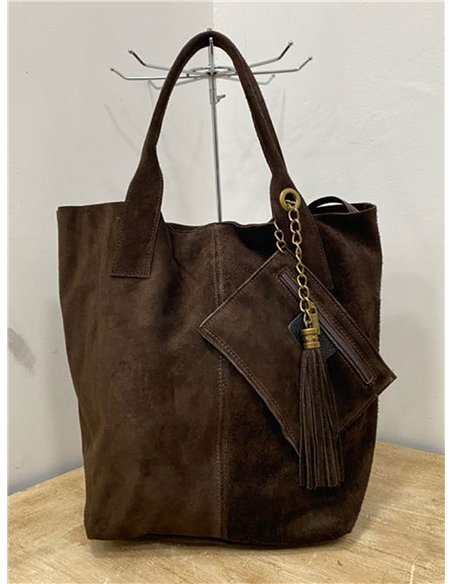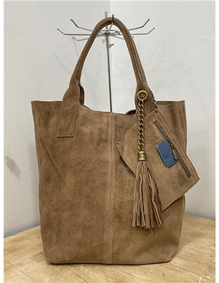 Shopper en daim avec porte-monnaie assorti. Poignées d'épaule. Fermeture à glissière métallique. Fabriqué en Italie.