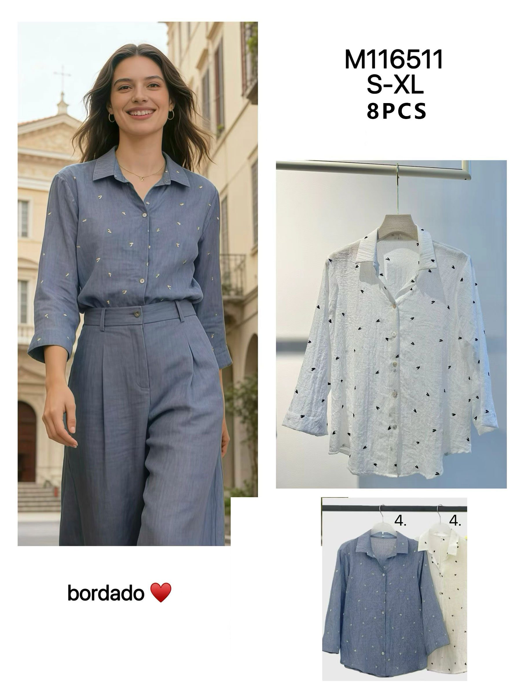 Chemise brodée cœurs manches 3/4