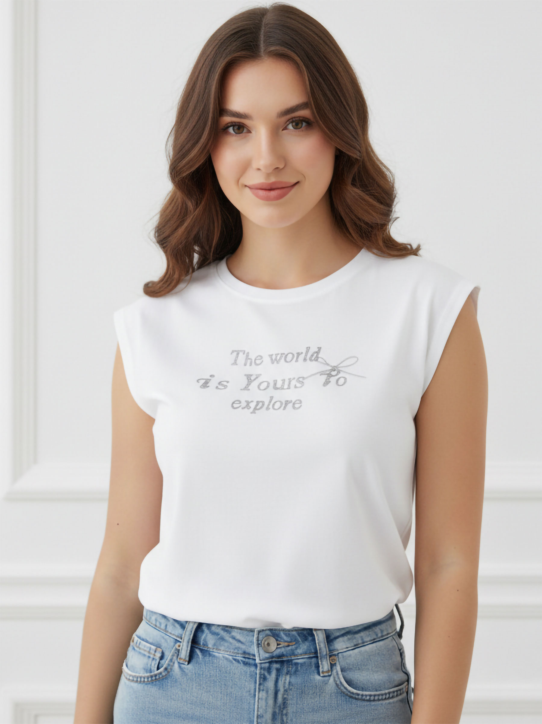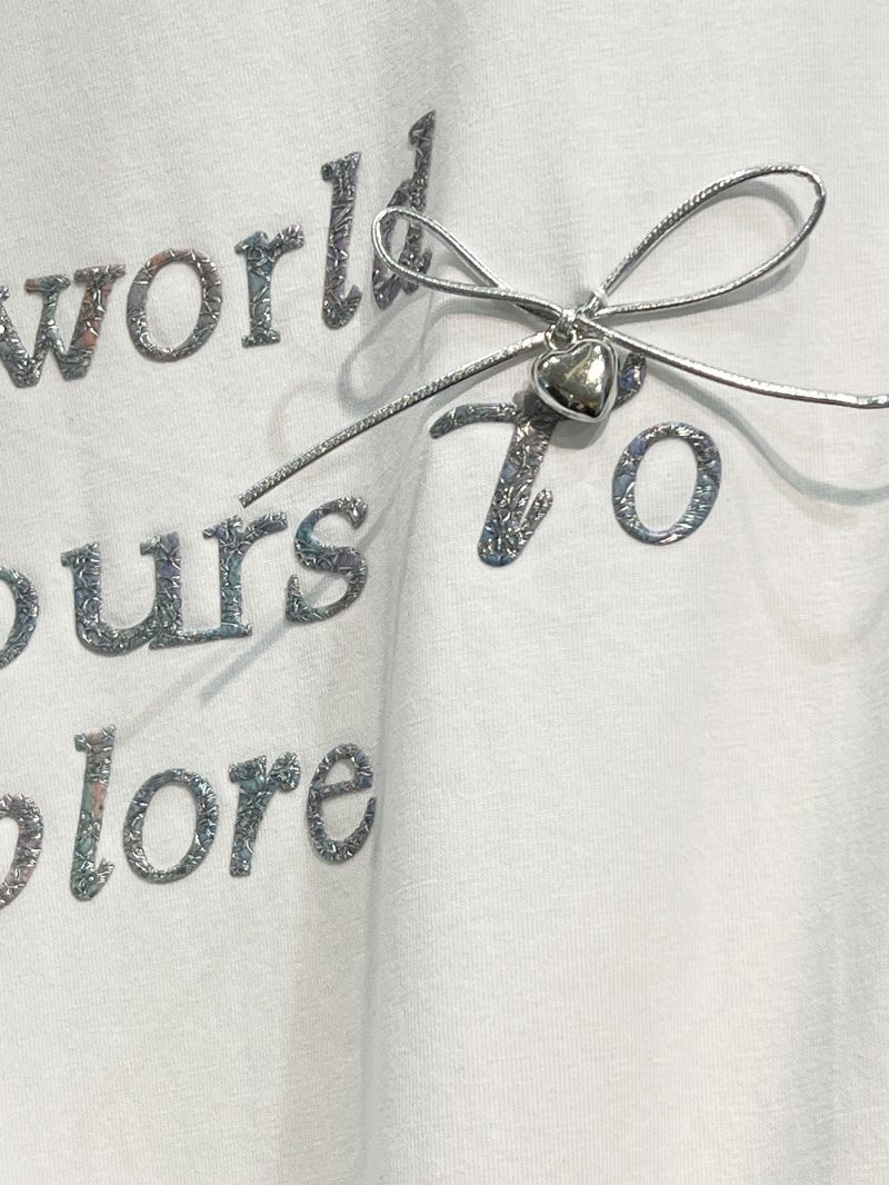 T-shirt avec inscription sur le devant. Nœud décoratif. Col rond. Manches courtes. Tissu extensible.