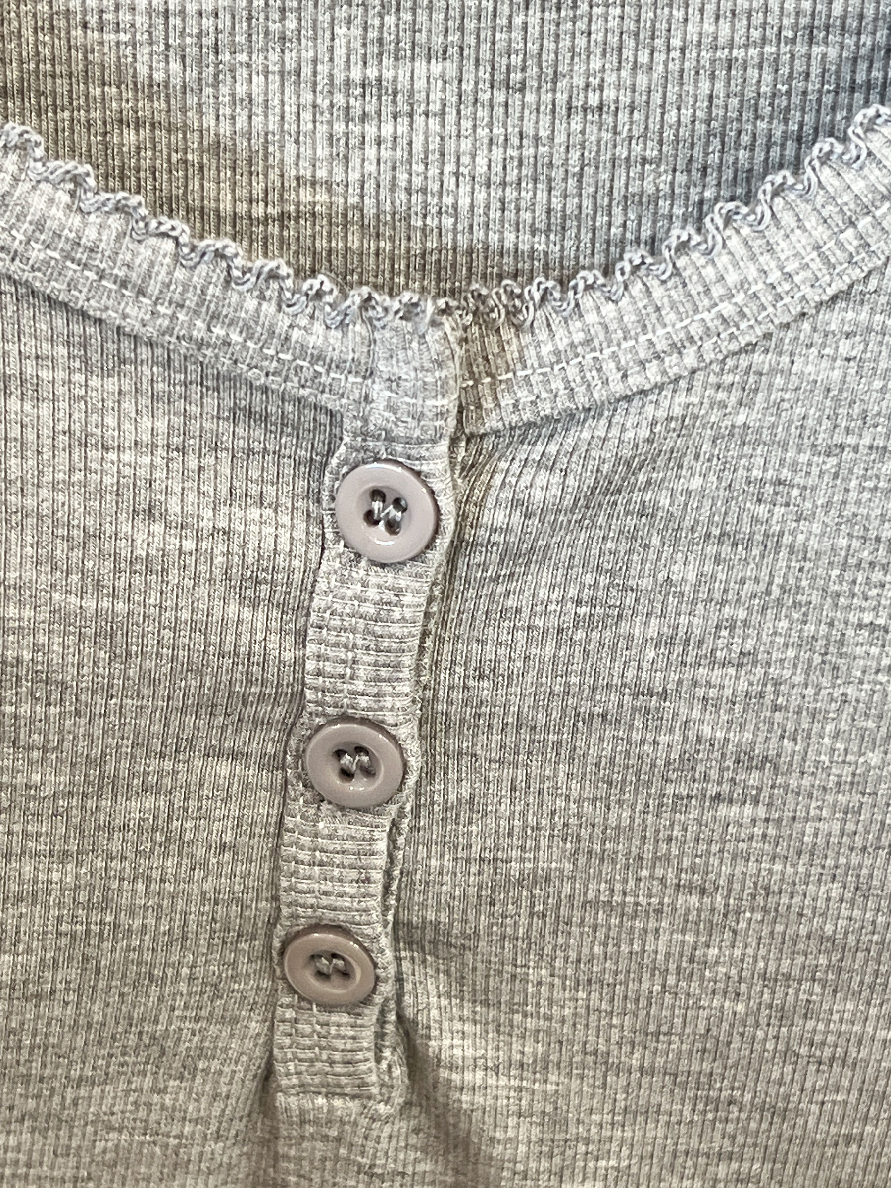 T-shirt en maille côtelée. Patte de boutonnage. Bordure ondulée au col et aux manches.