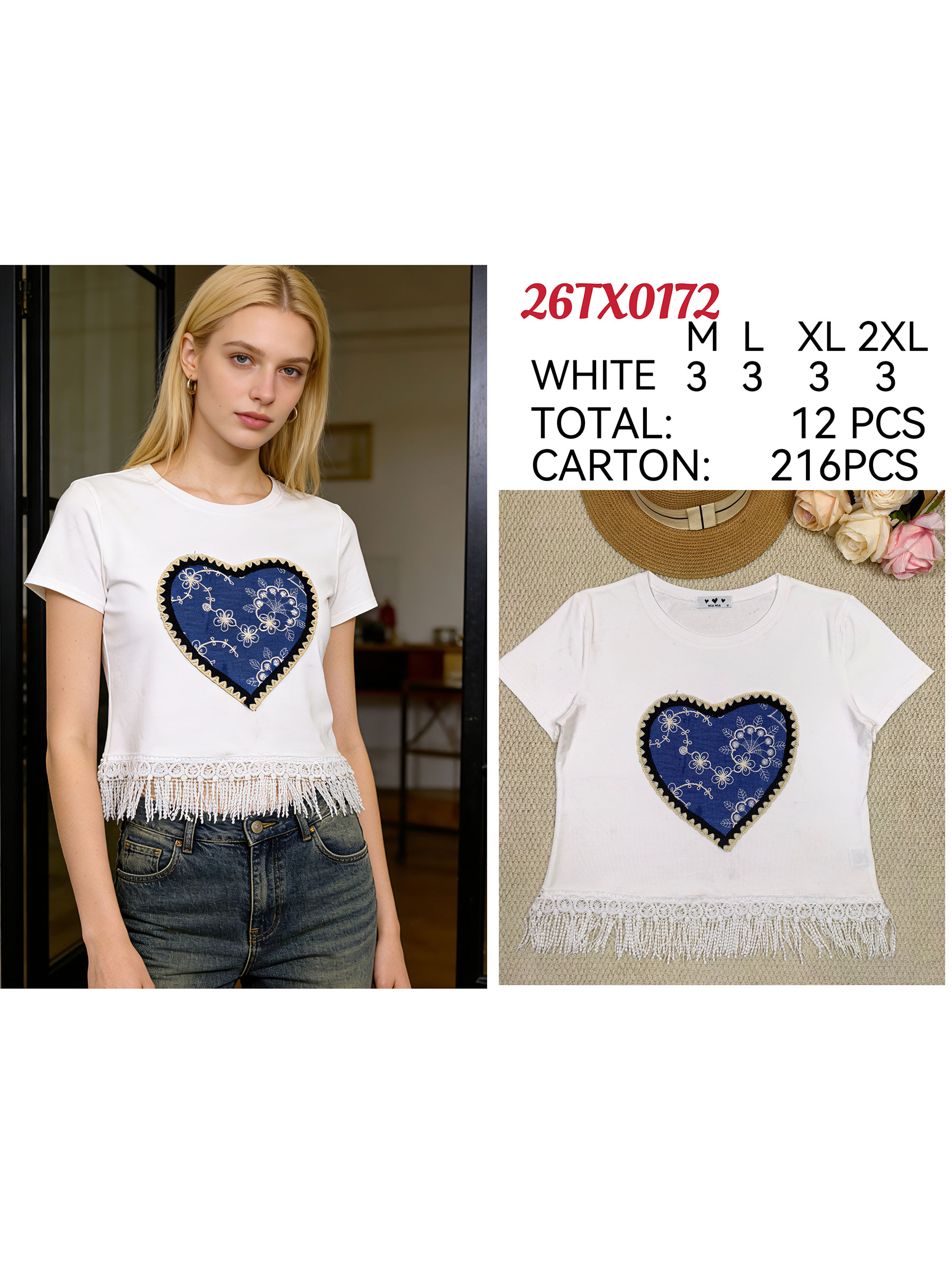 T-shirt à manches courtes. Écusson cœur contrastant et ourlet à franges. Col rond. Collection : Printemps/Été 2026