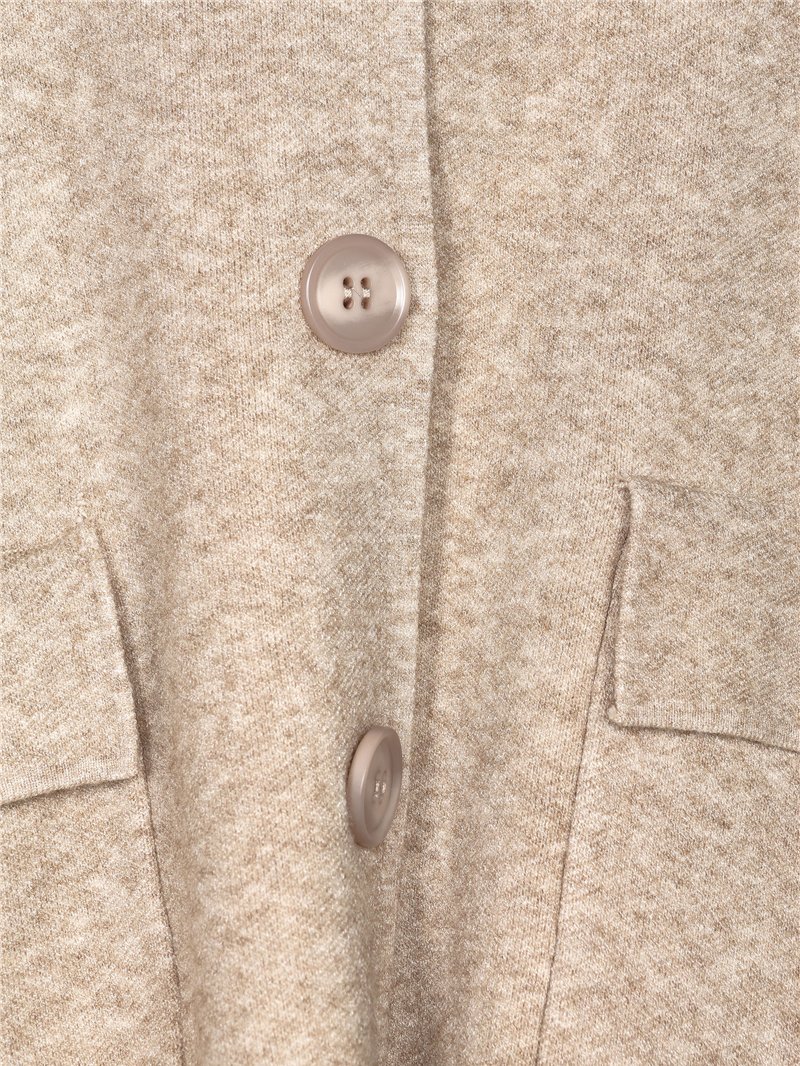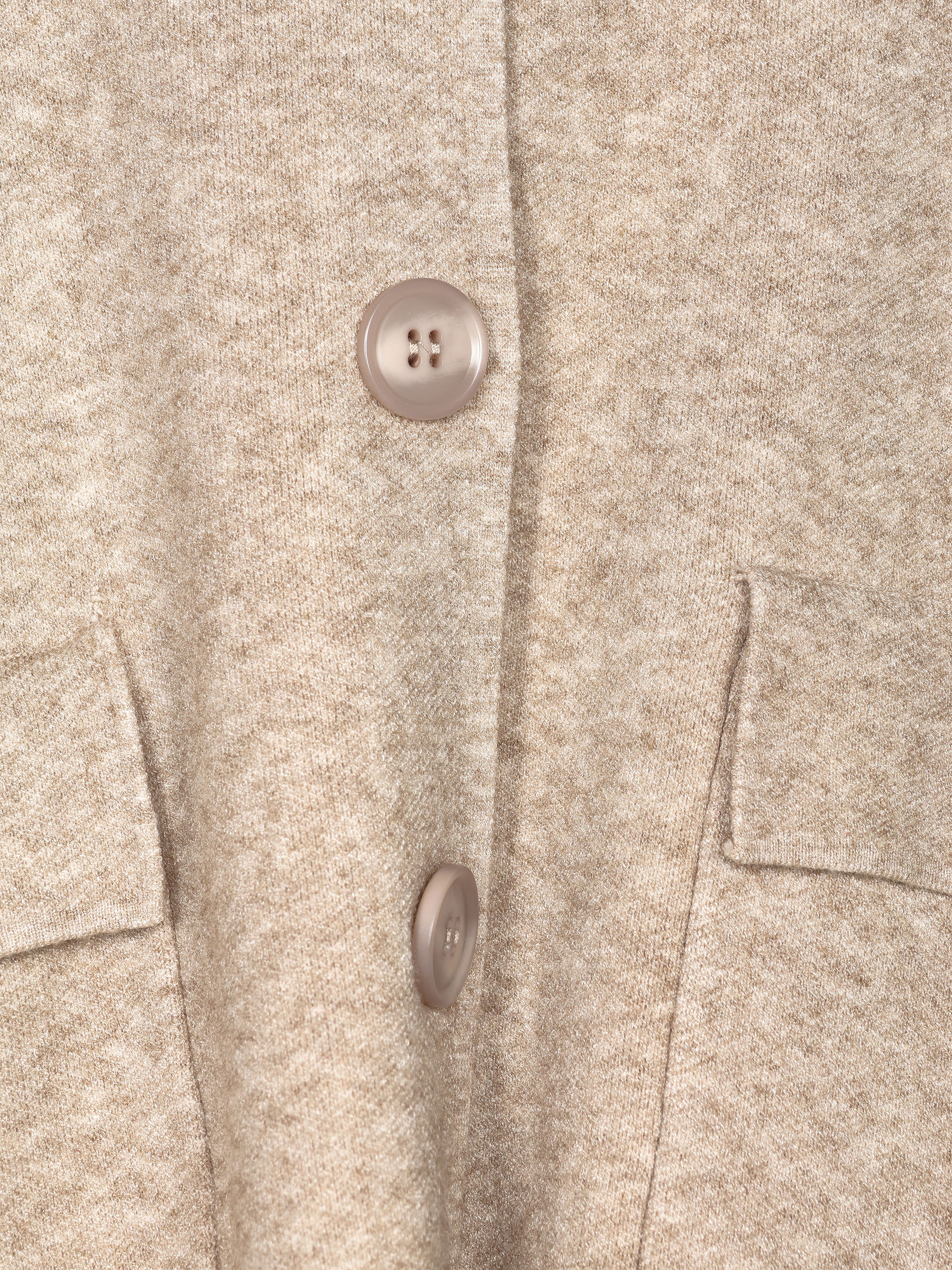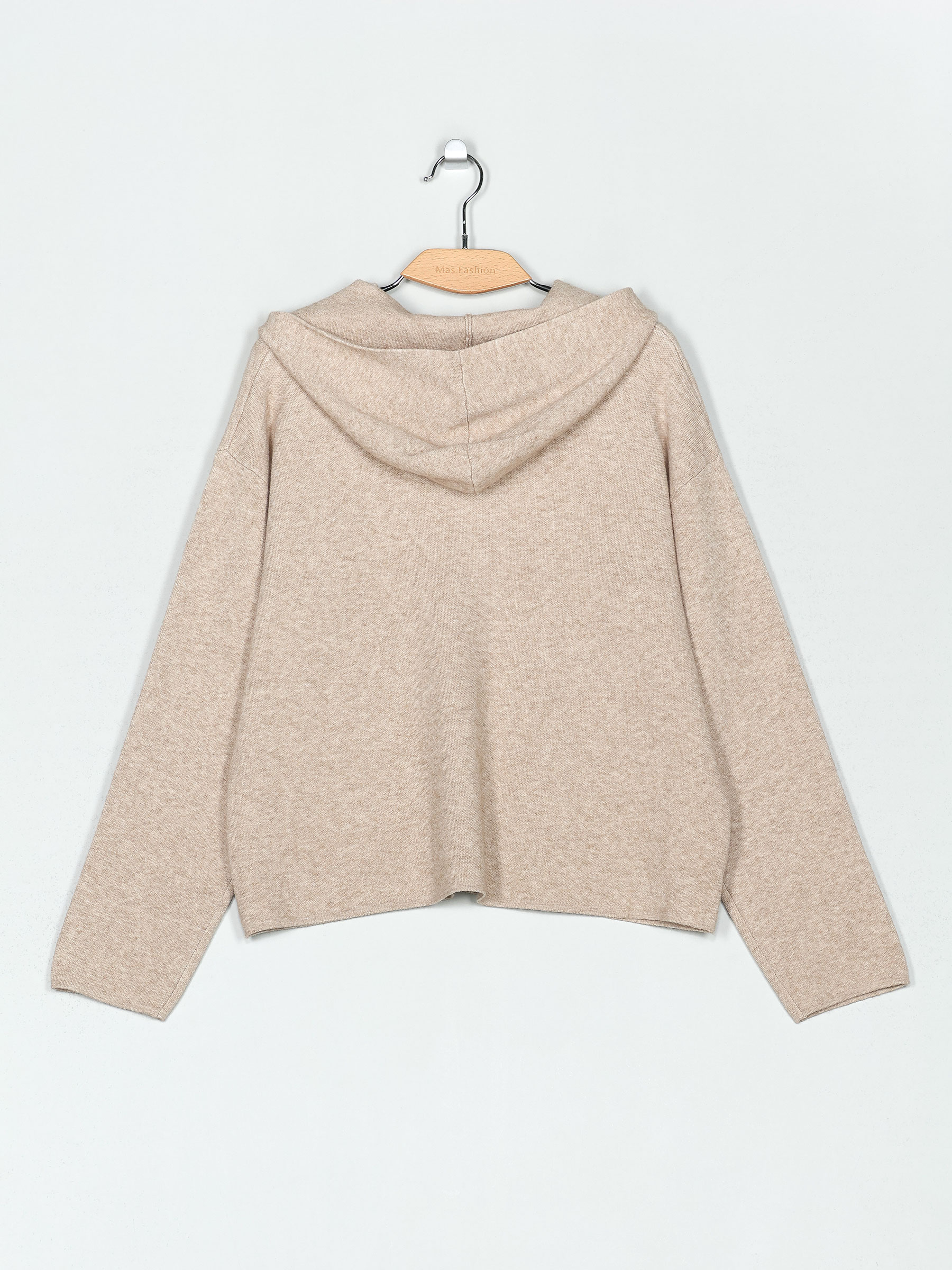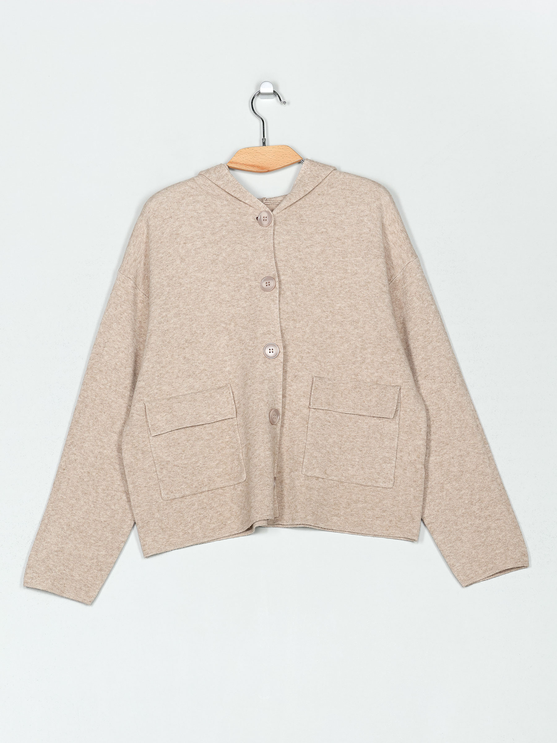 Veste en tricot chaud avec capuche. Toucher doux. Poches plaquées sur le devant. Manches longues. Fermeture par boutons.
