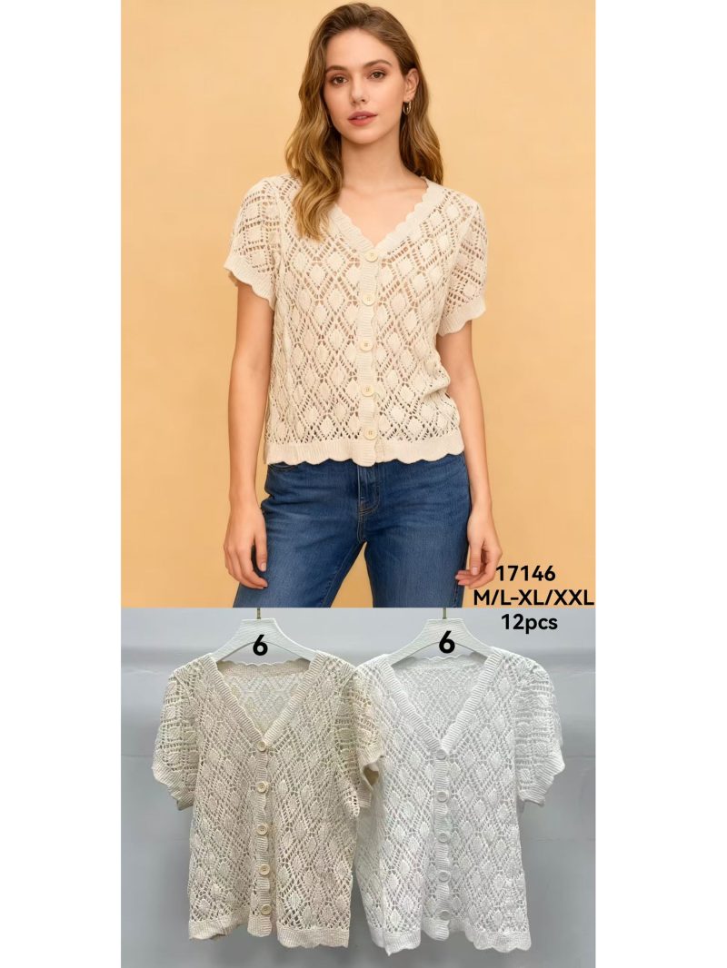 Gilet ajouré. Point losange. Col en V. Manches courtes. Fermeture boutonnée. Ourlet festonné.