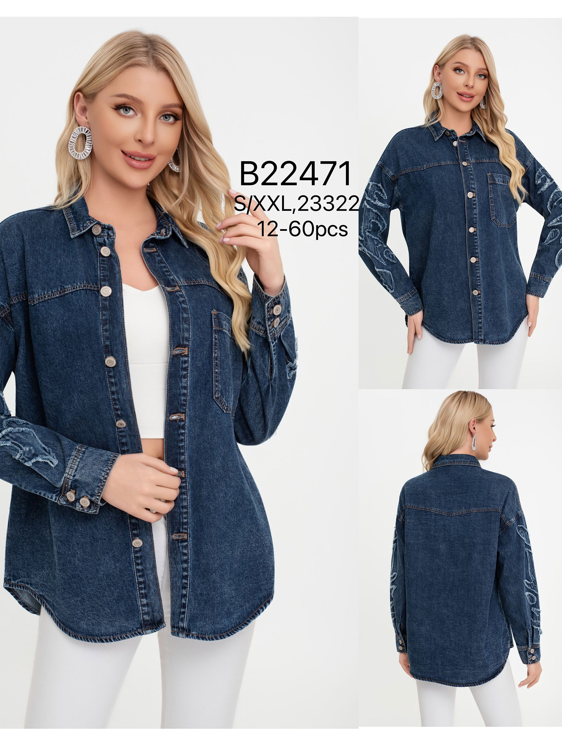 Chemise en jean. Tissu non extensible. Poche plaquée sur la poitrine. Col à revers. Manches longues avec détail effiloché. Fermeture boutonnée sur le devant. Mesures pour la taille S : longueur - 74 cm, poitrine - 104 cm, taille - 104 cm.