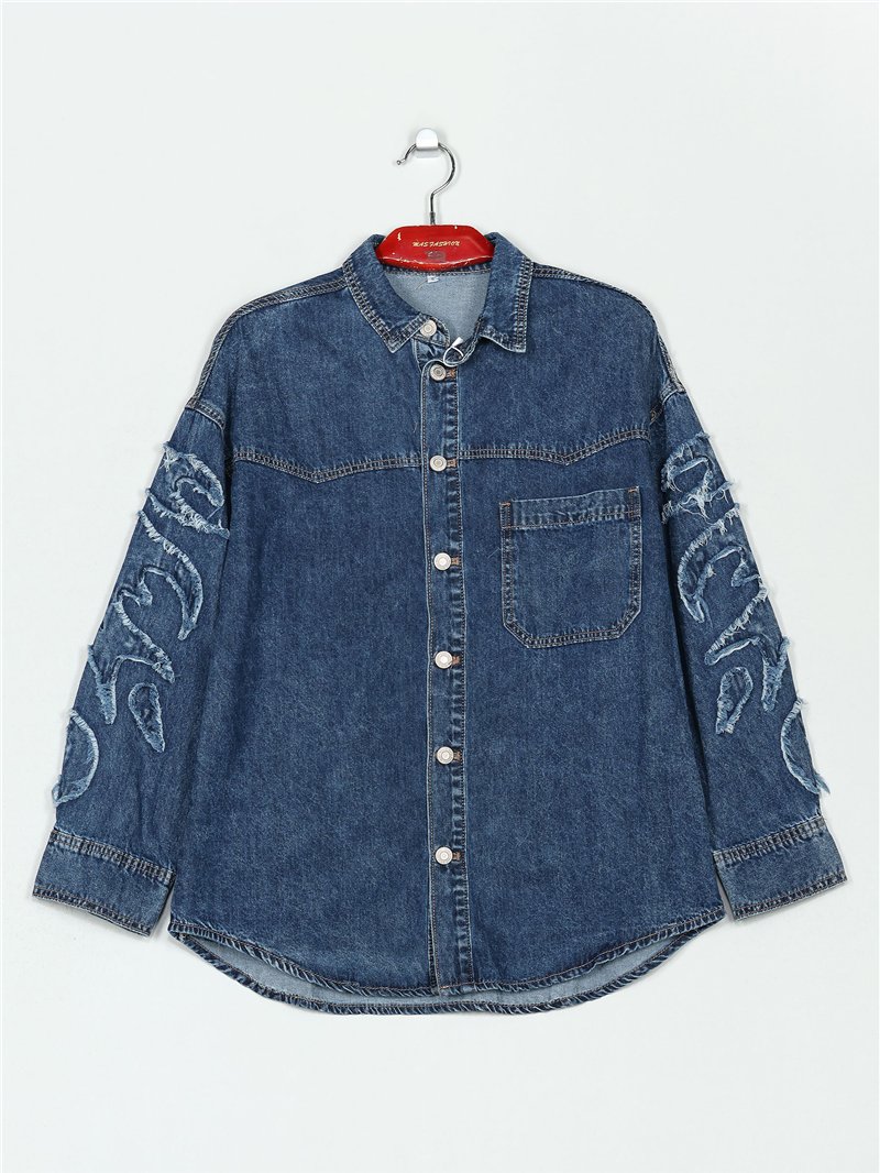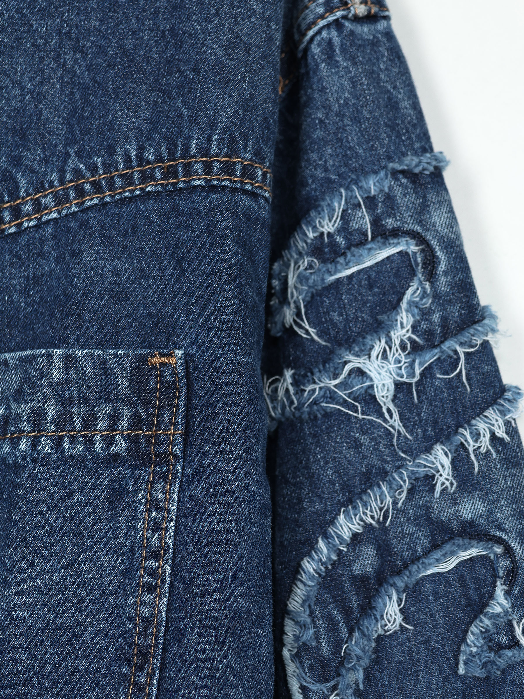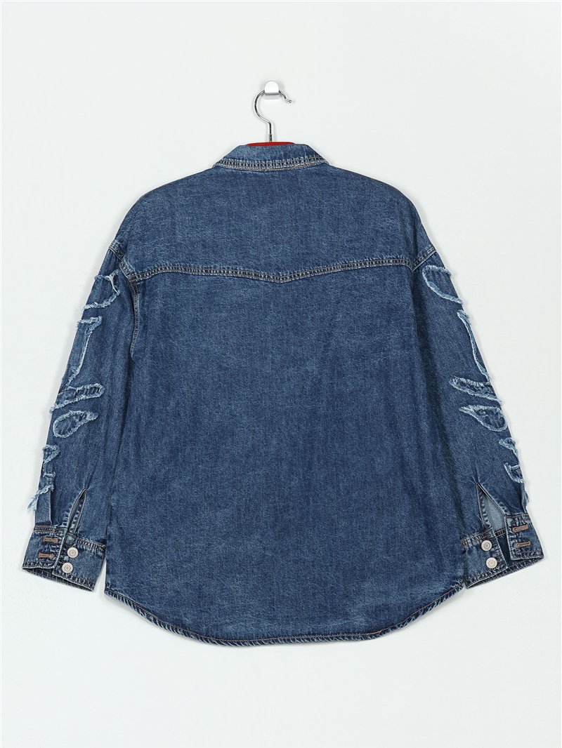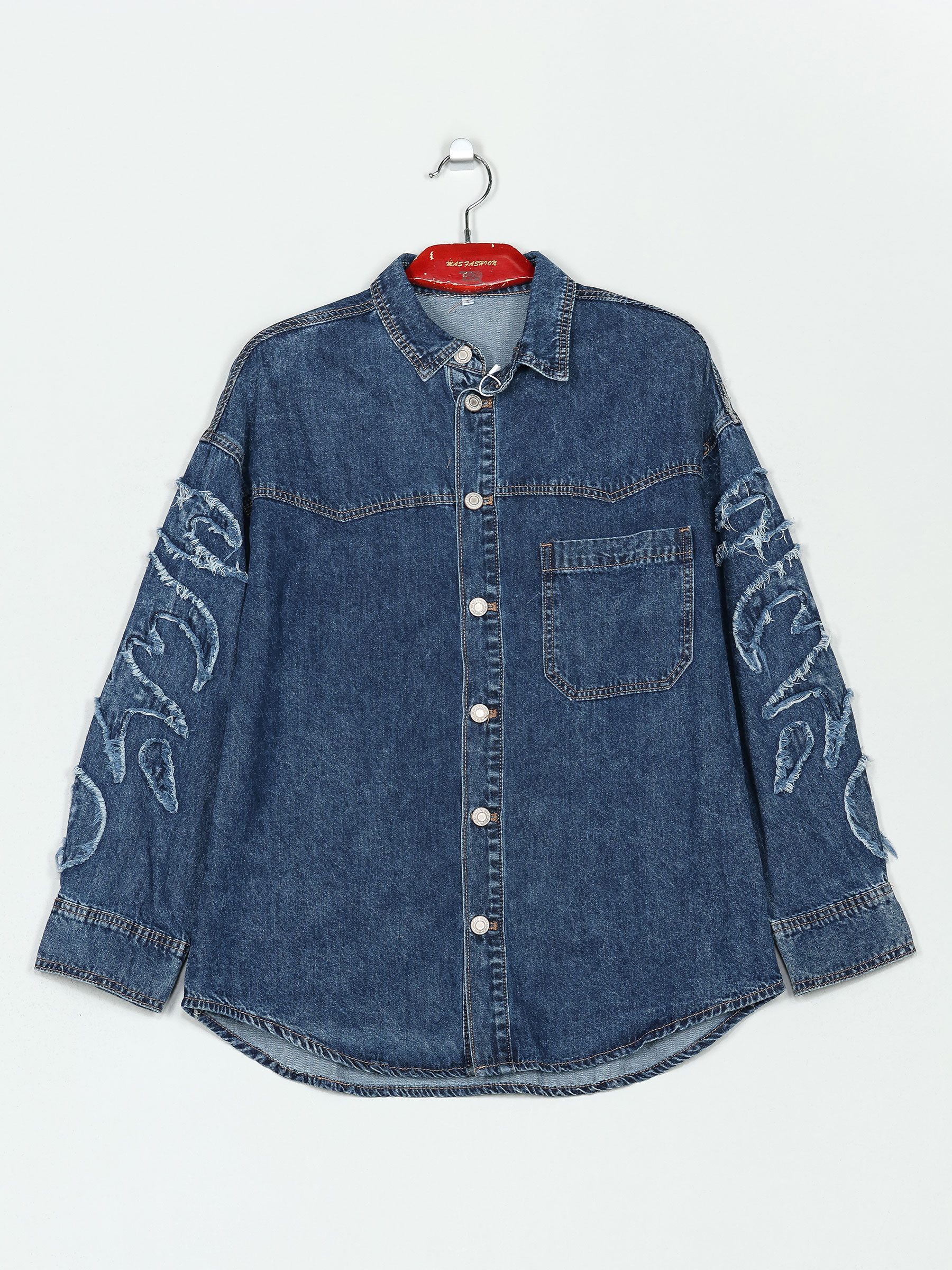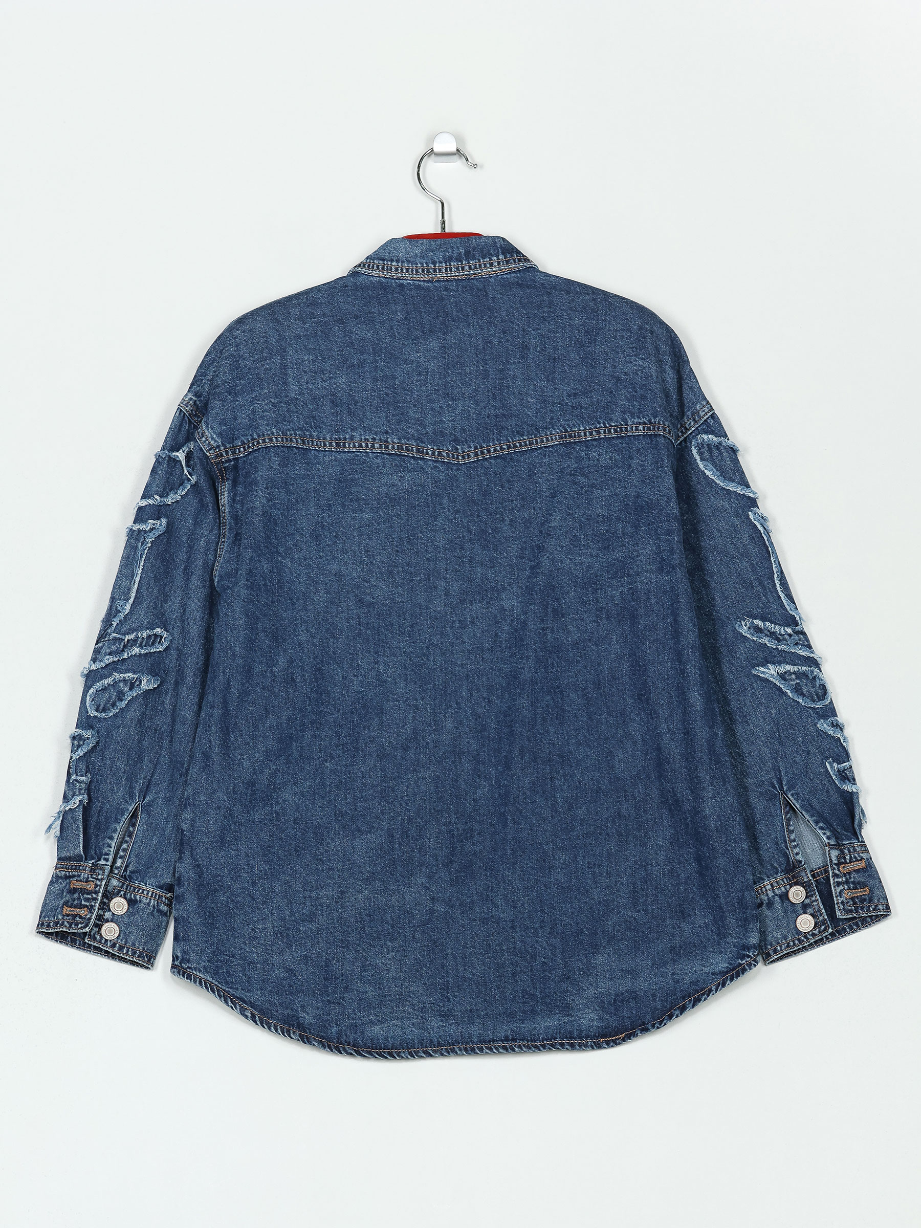 Détails de la chemise surchemise en denim à manches effilochées MF-B22471