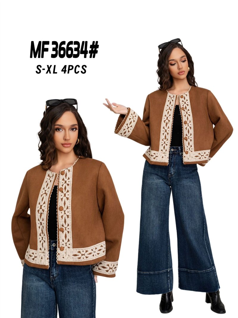 Veste effet daim. Détail au crochet. Col rond. Manches longues. Fermeture par boutons.