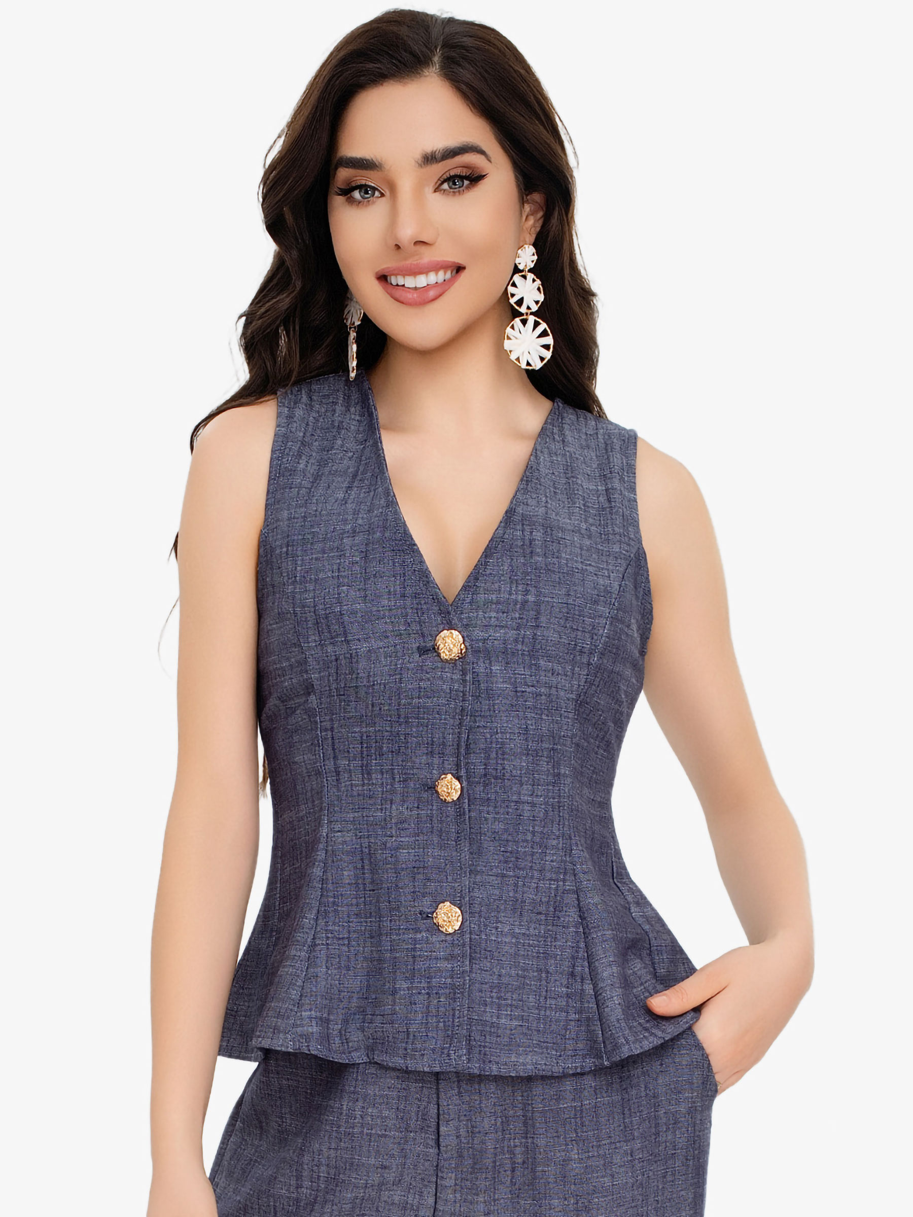 Débardeur sans manches effet lin. Encolure en V et fermeture avant avec boutons bijoux.