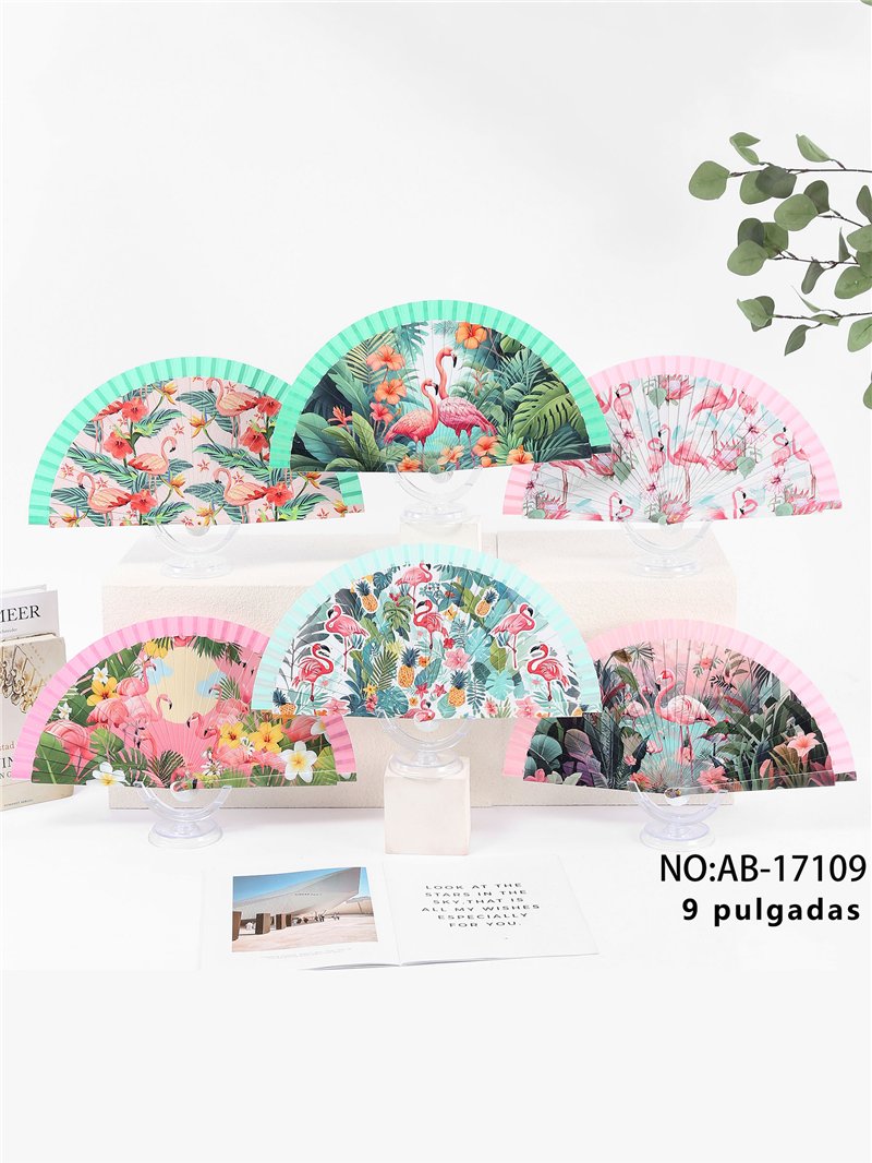 Éventail en bois imprimé d'un motif de flamants roses tropicaux. Impression recto seulement. 23 cm. Couleurs assorties. Collection : Printemps/Été 2026