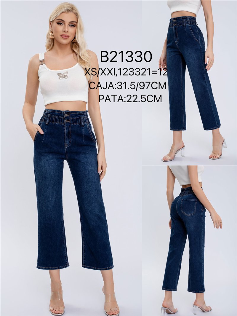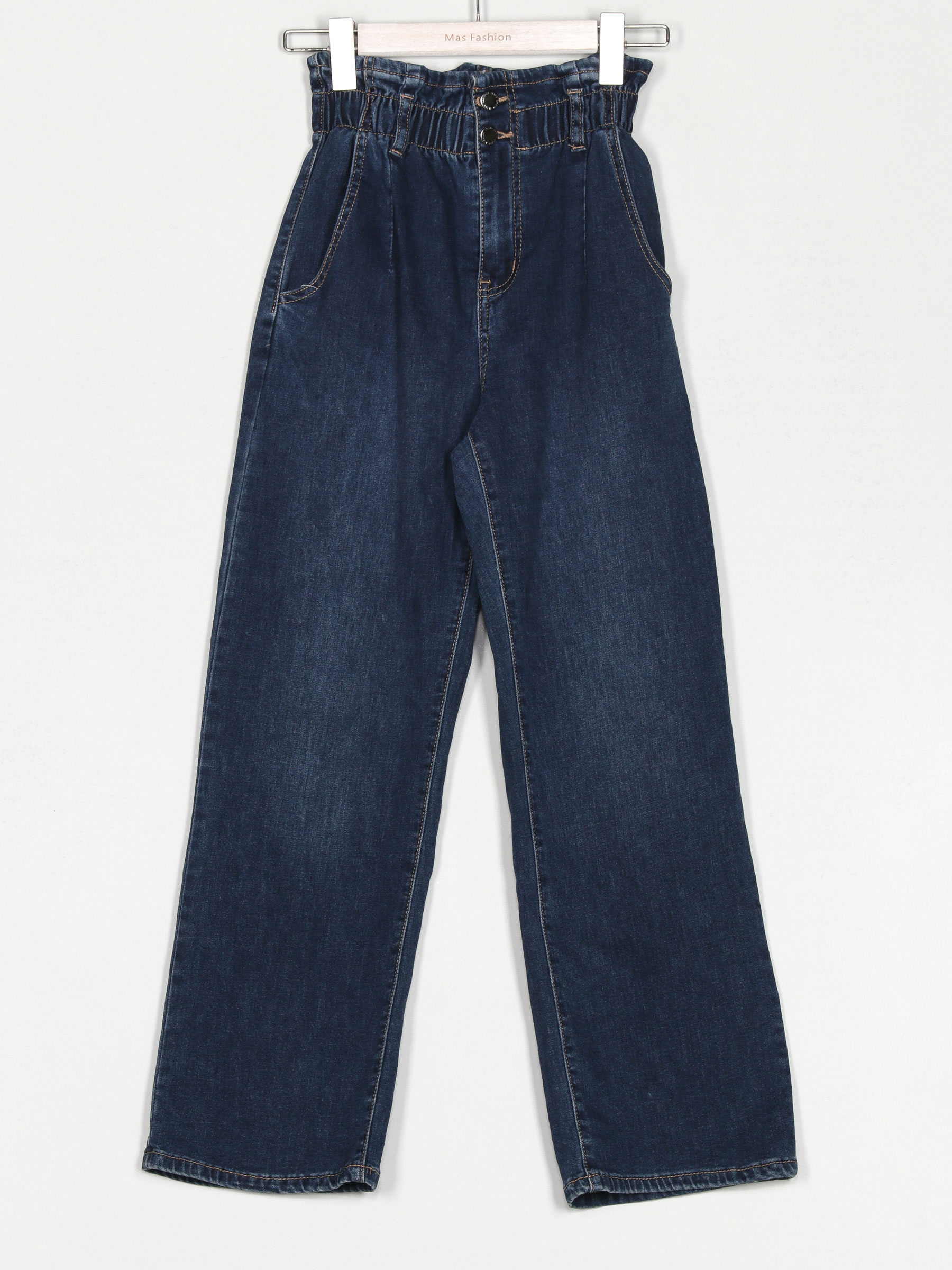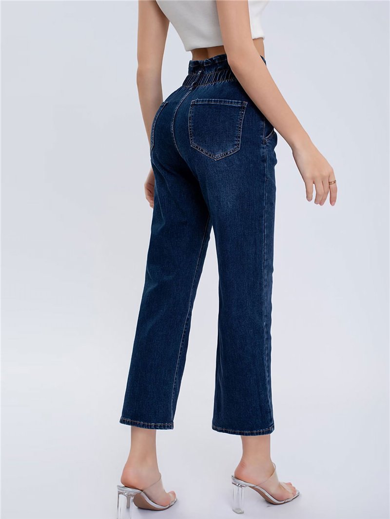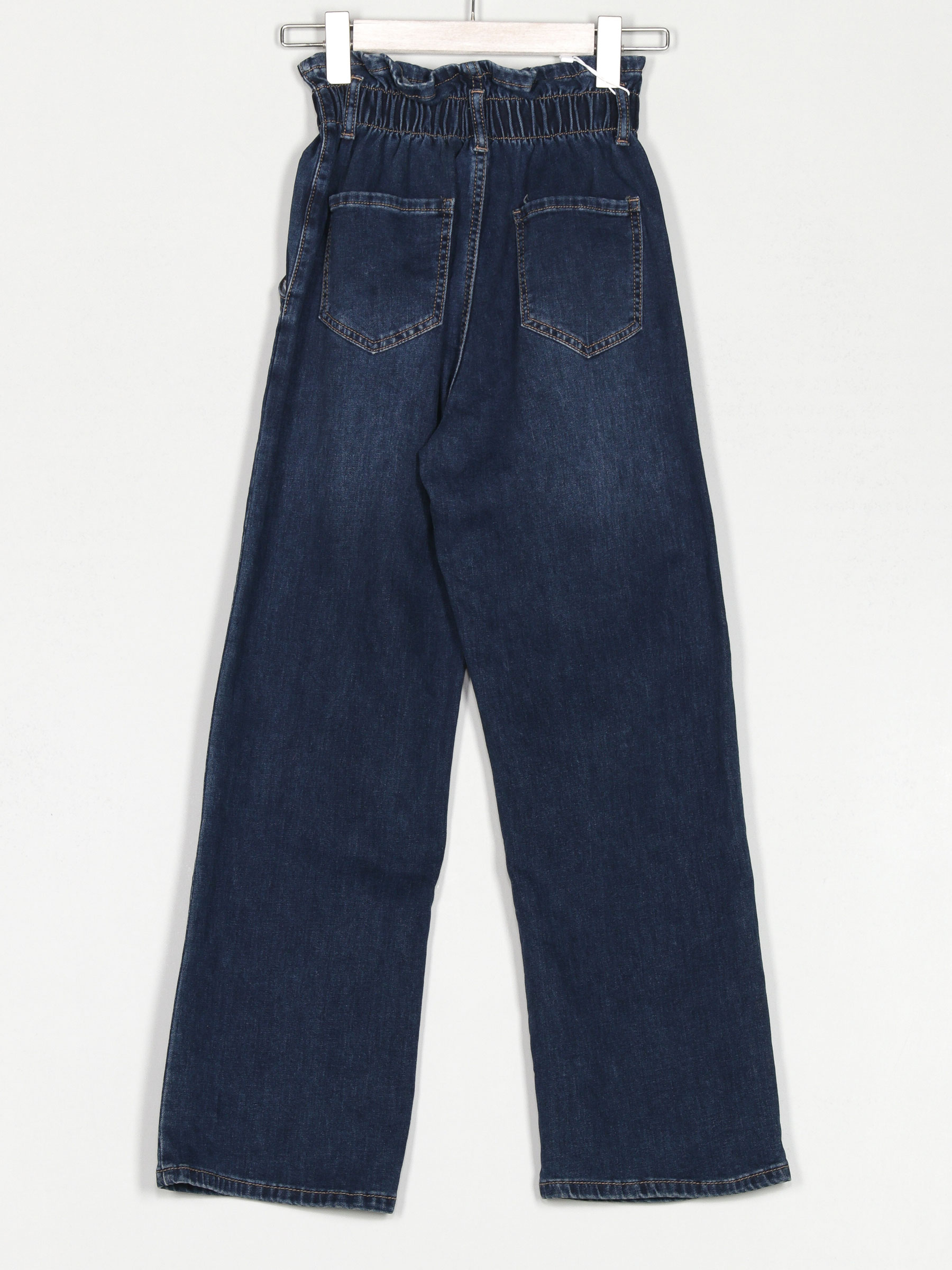 Jean taille haute. Détail de taille élastique de type paper bag. Quatre poches. Fermeture avant avec fermeture éclair et bouton métallique.