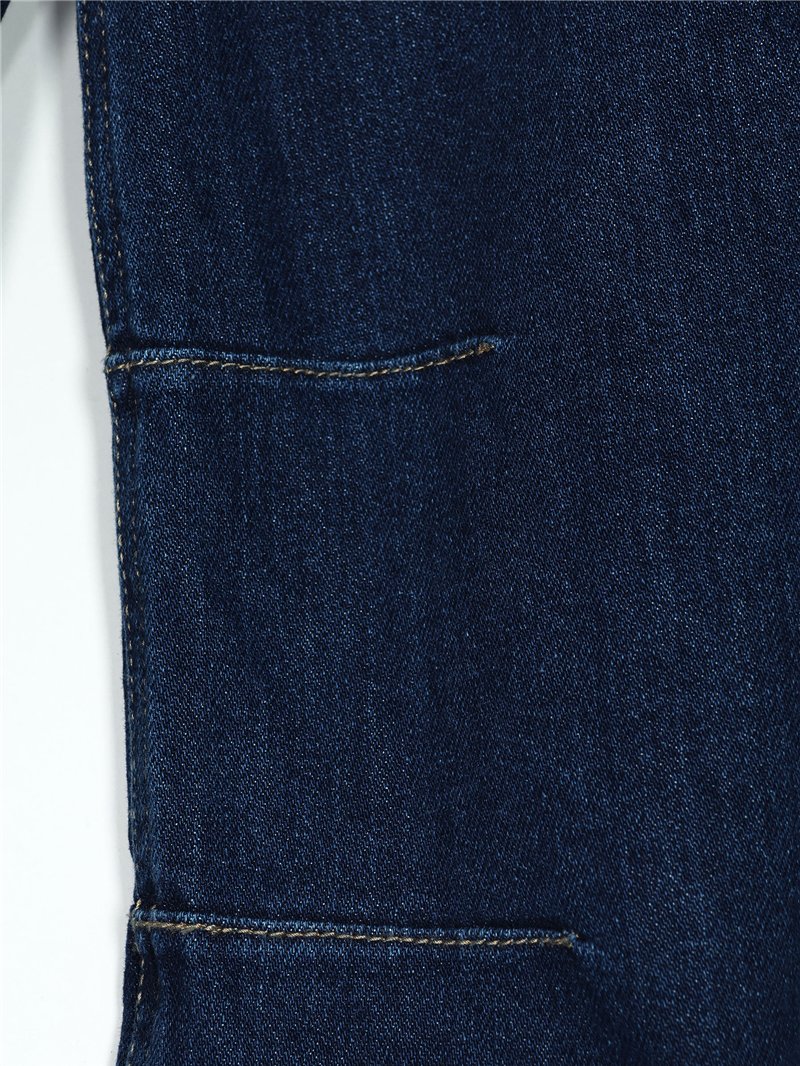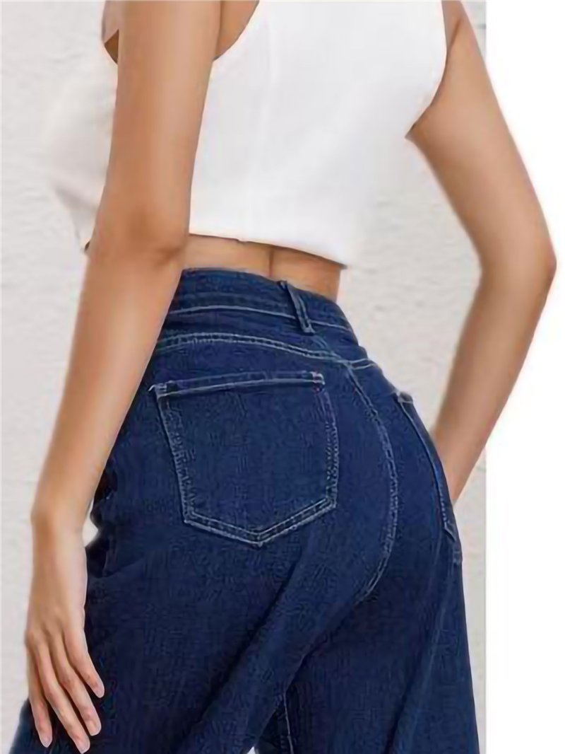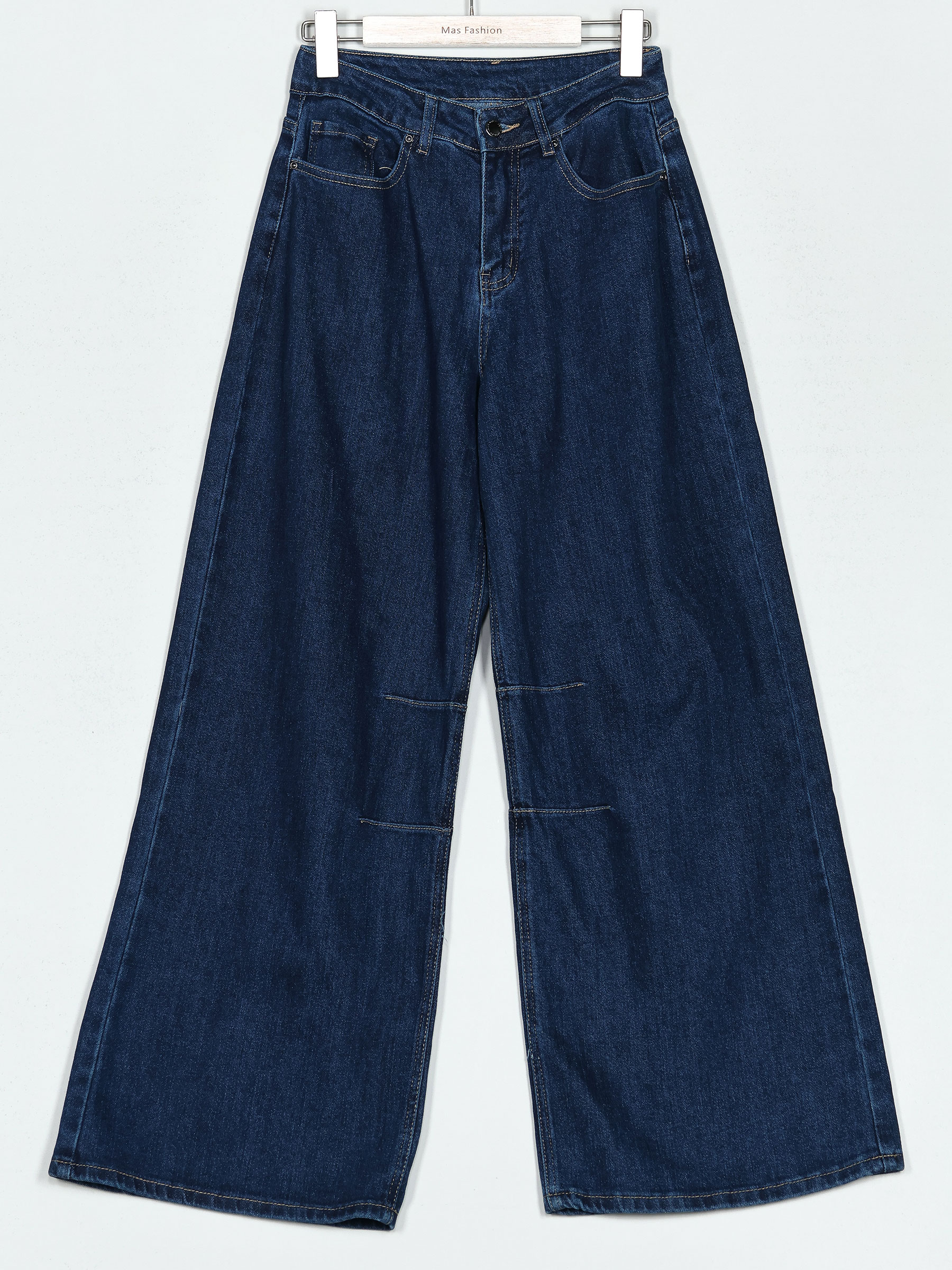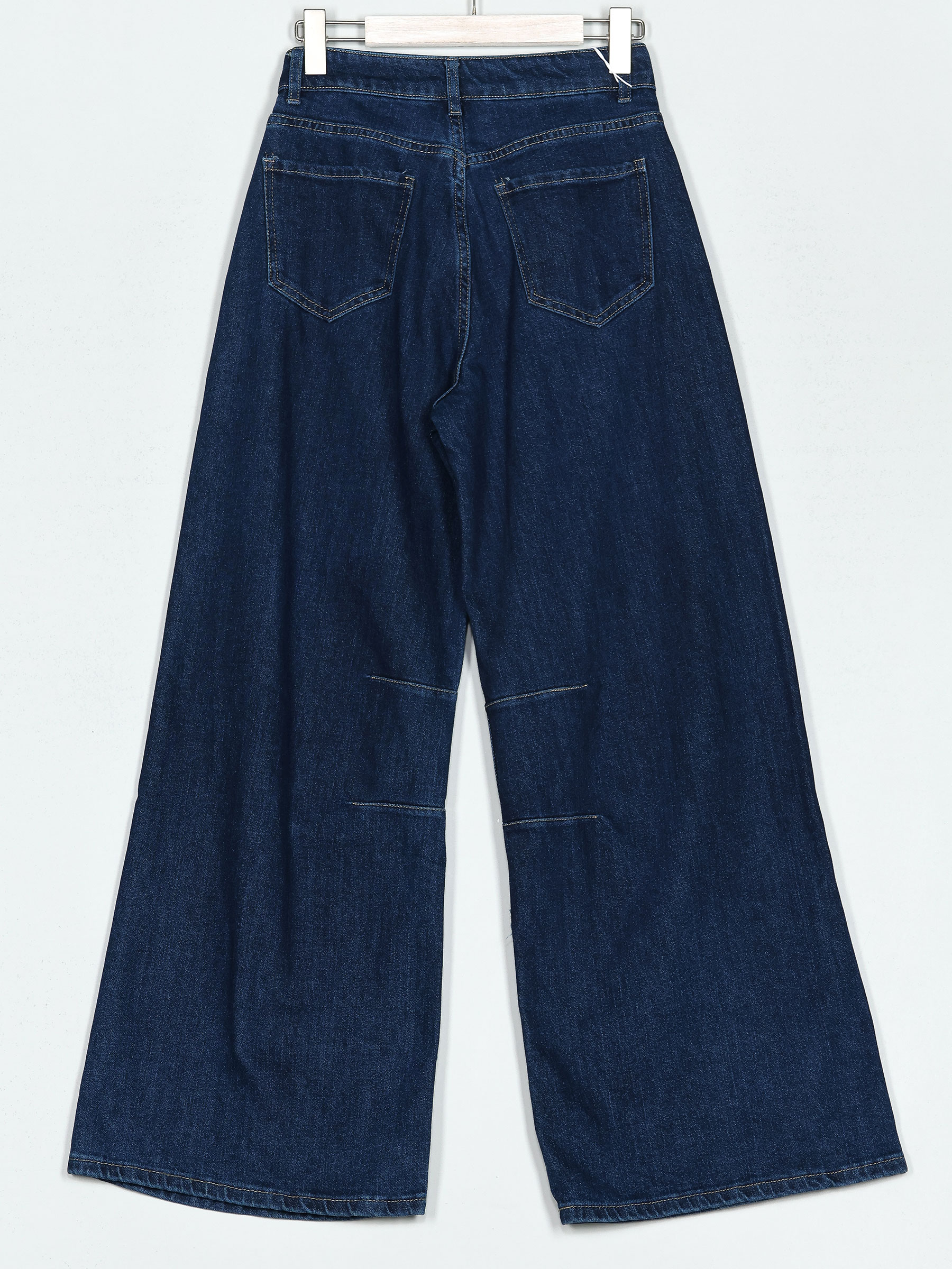Jean à jambe large. Taille haute. Cinq poches. Fermeture avant avec fermeture éclair et bouton métallique.