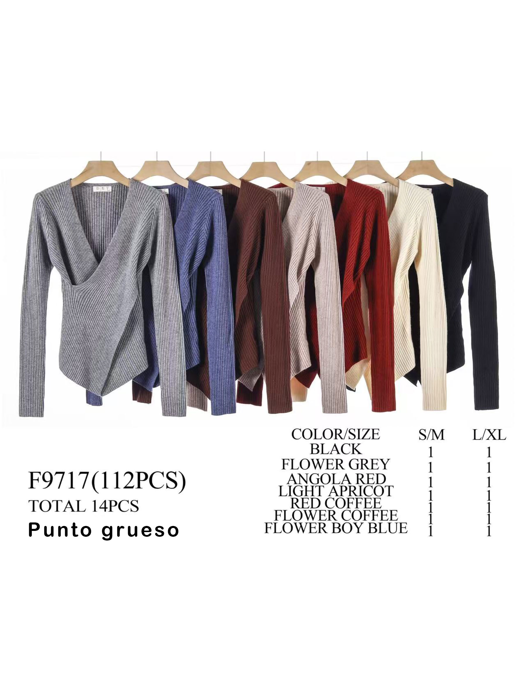 Pull en côtes tricotées chaudes. Toucher doux. Encolure croisée. Manches longues.