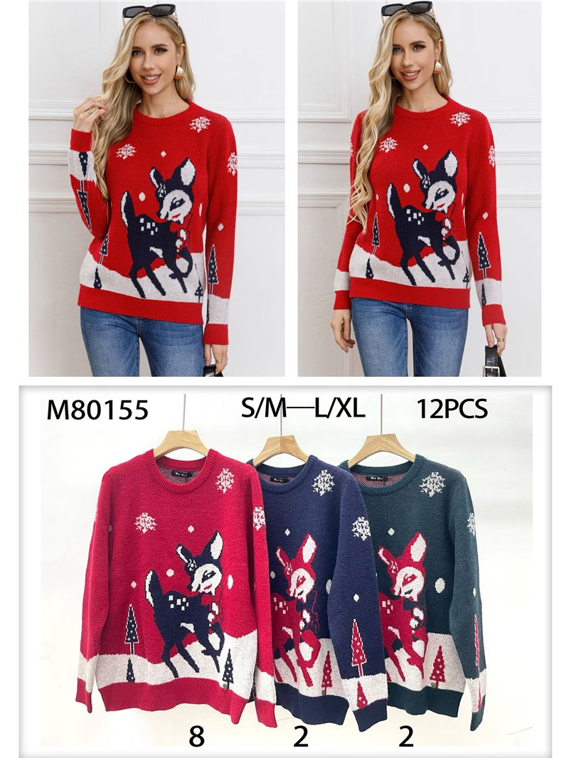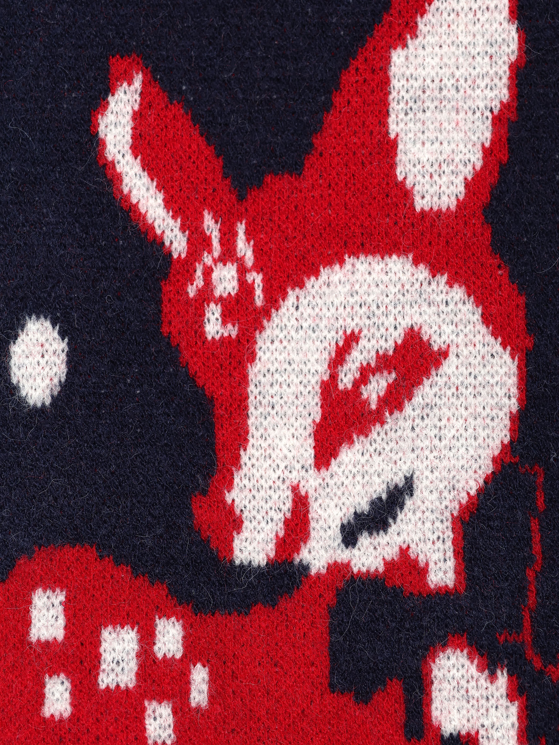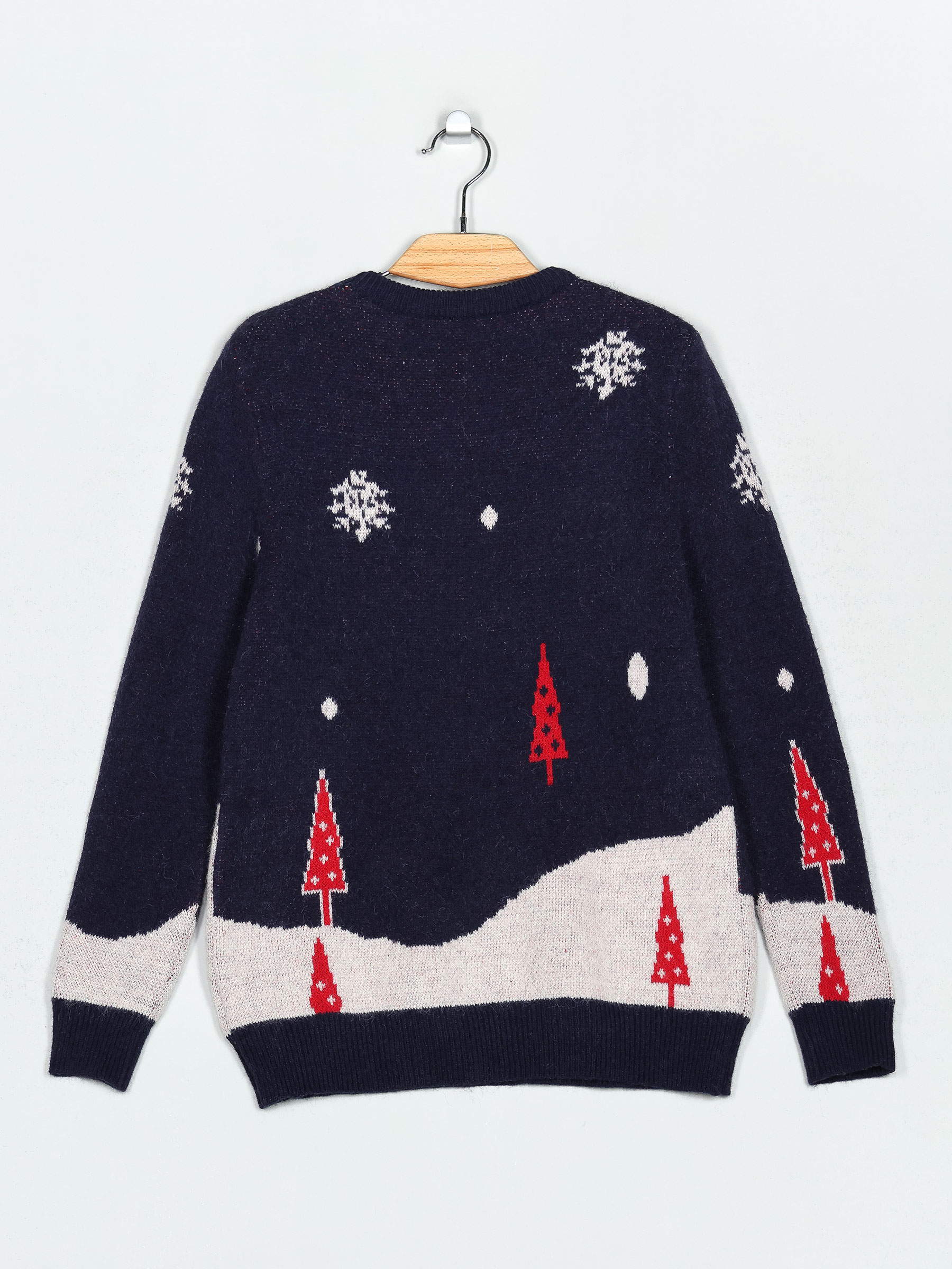 Pull en tricot à col rond avec scène de cerf et arbres sur la neige.