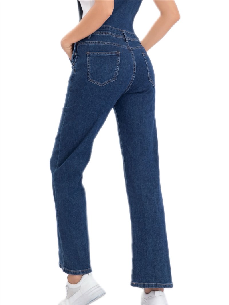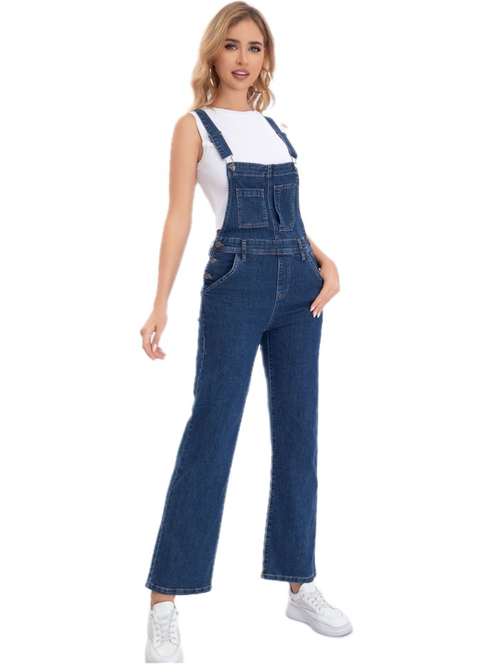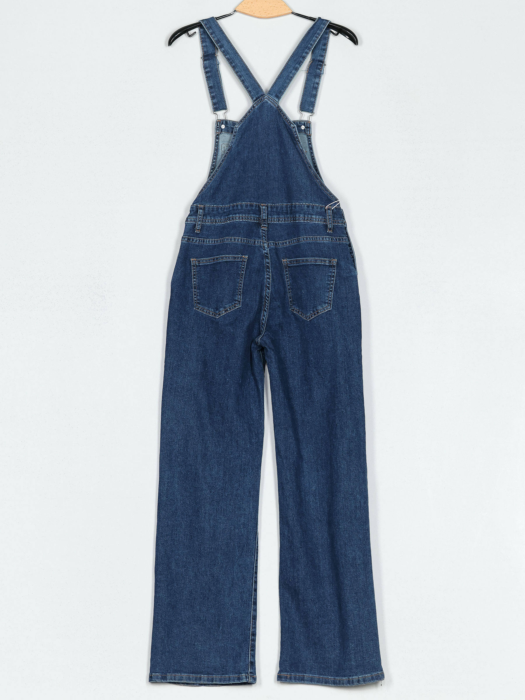 Salopette en denim longue. Droite. Fermeture par boutons sur le côté. Bretelles ajustables avec fermoir métallique.