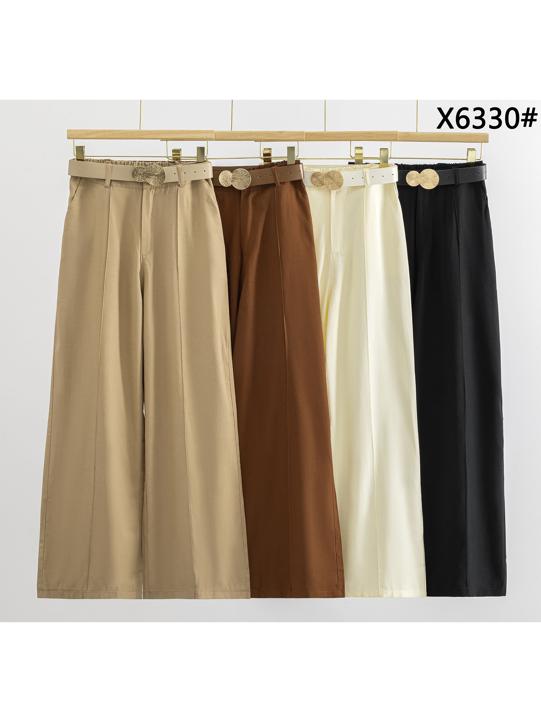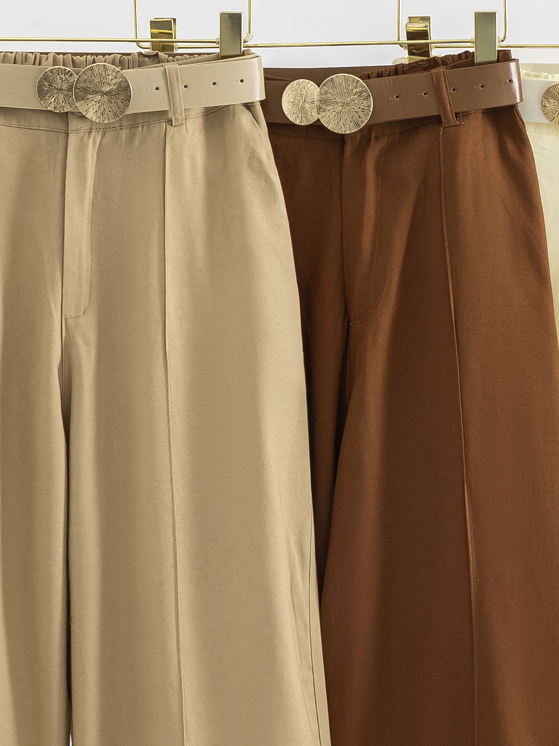 Pantalon taille haute à jambes larges avec plis sur le devant et ceinture assortie à boucle décorative.