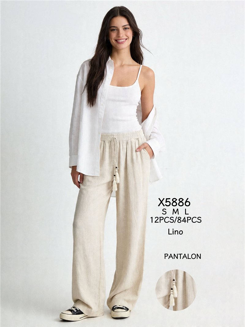 Pantalon palazzo en lin. Taille élastiquée. Cordon de serrage à pompons. Poches latérales. Jambes larges.