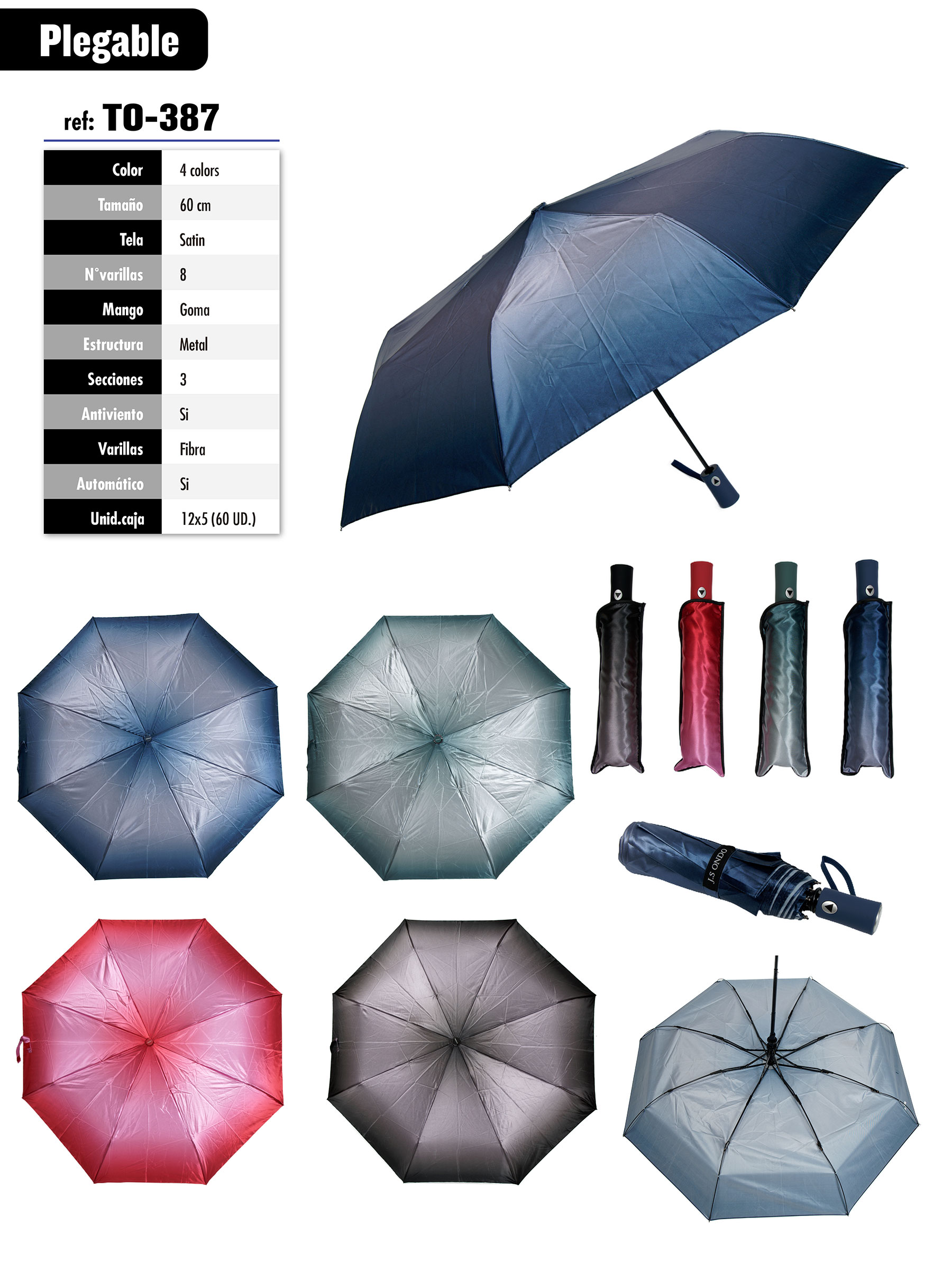 Parapluie pliant satiné. Tissu satiné. Anti-vent. Automatique. 8 baleines en fibre. Poignée en caoutchouc. Structure en métal. 3 sections. Couleurs assorties.