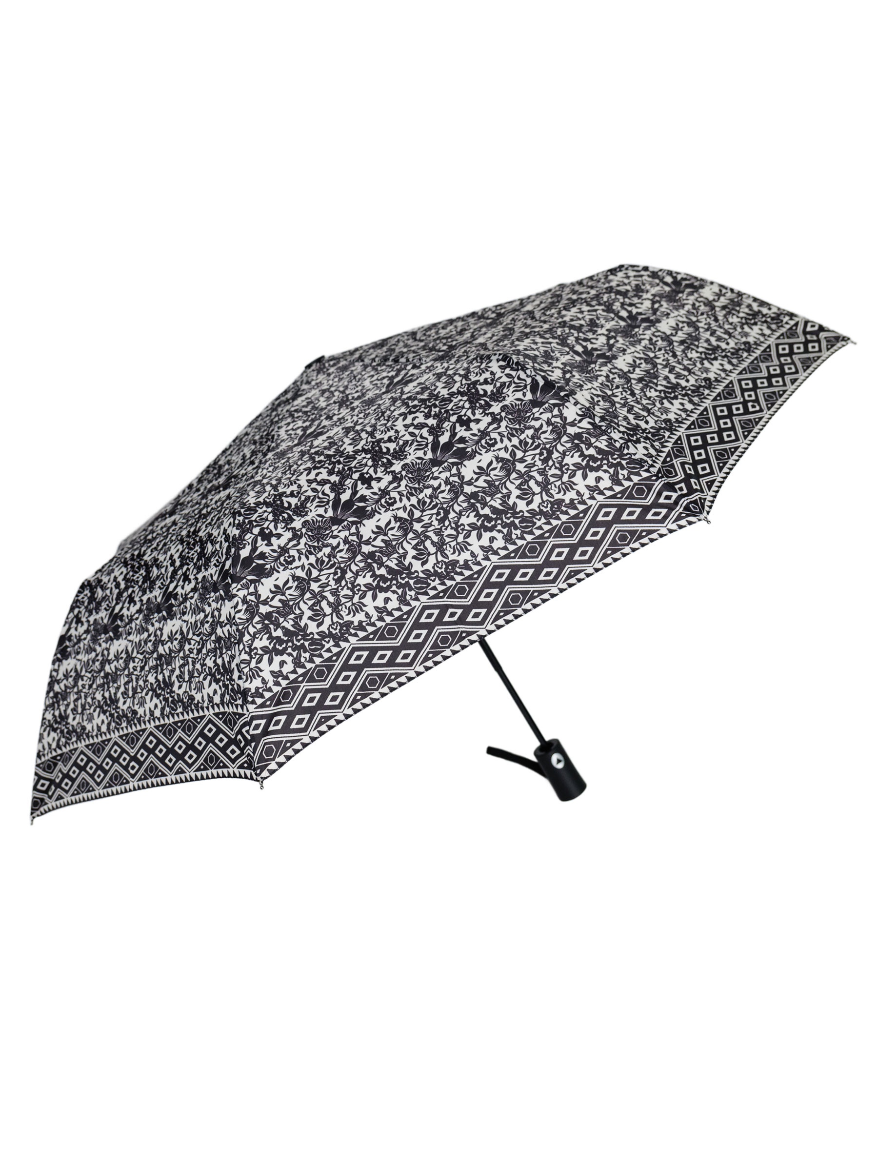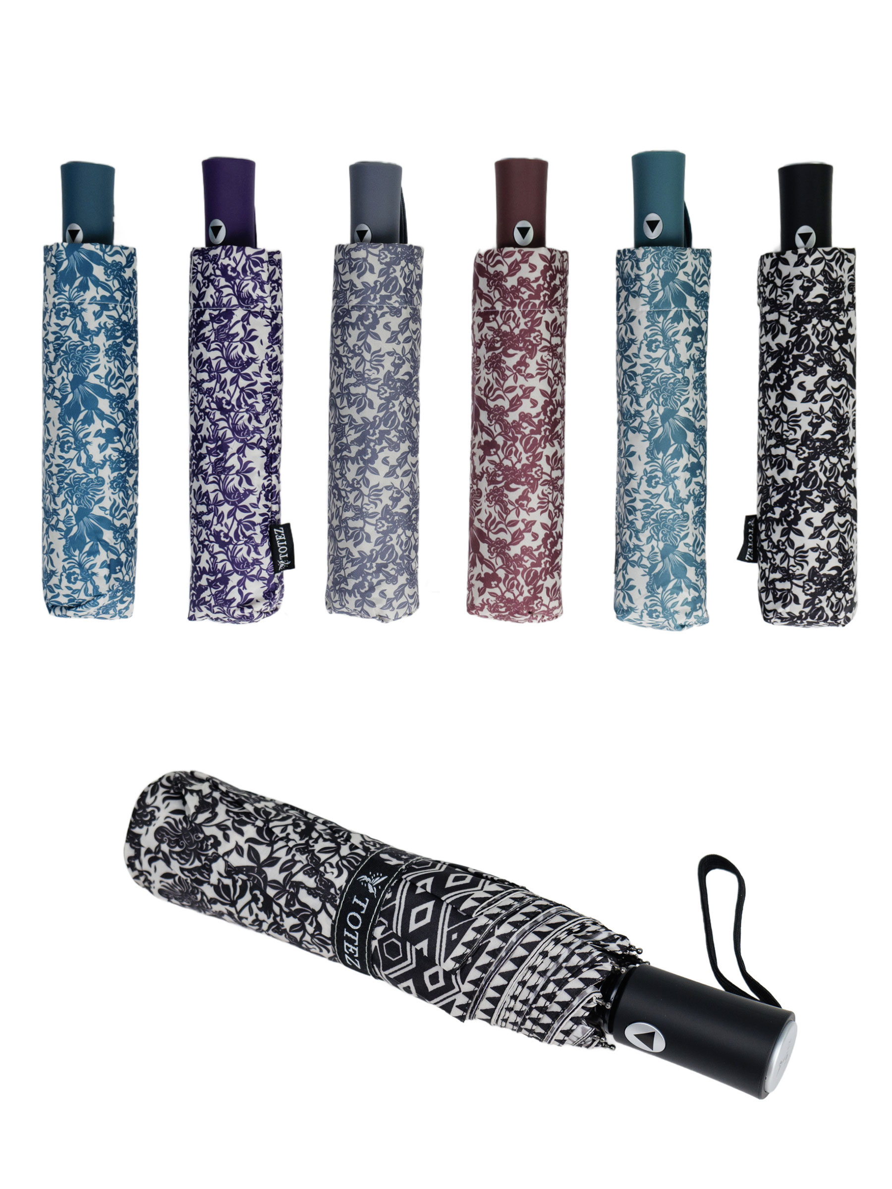 Parapluie pliant imprimé. Tissu PG. Anti-vent. Automatique. 8 baleines en fibre. Poignée en caoutchouc. Structure en métal. 3 sections. Couleurs assorties.