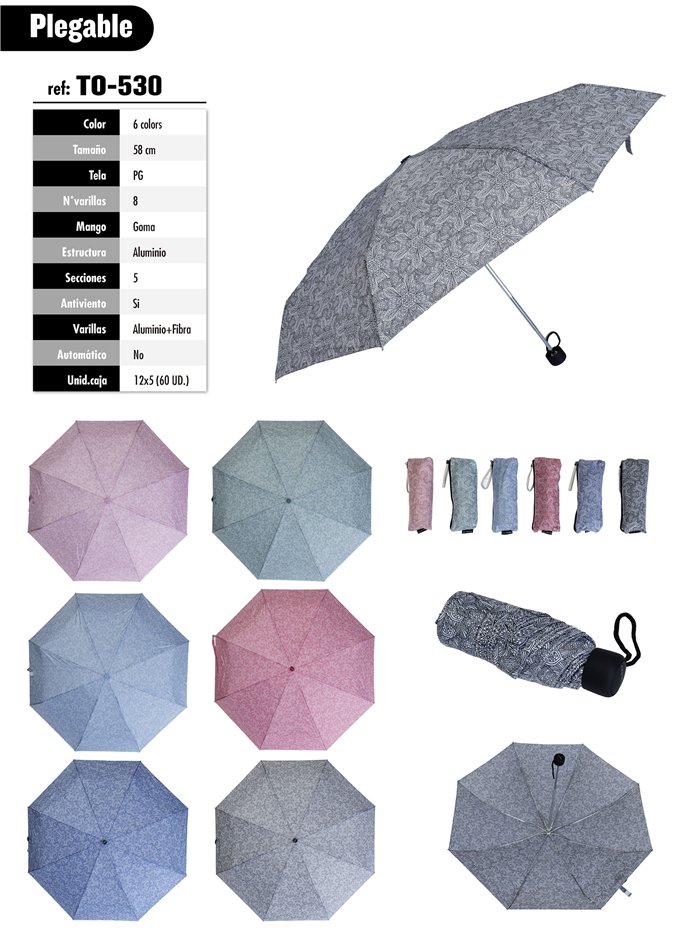 Mini parapluie pliable imprimé. Tissu PG. Anti-vent. Non automatique. 8 baleines en aluminium et fibre. Poignée en caoutchouc. Structure en aluminium. 5 sections. Couleurs assorties.