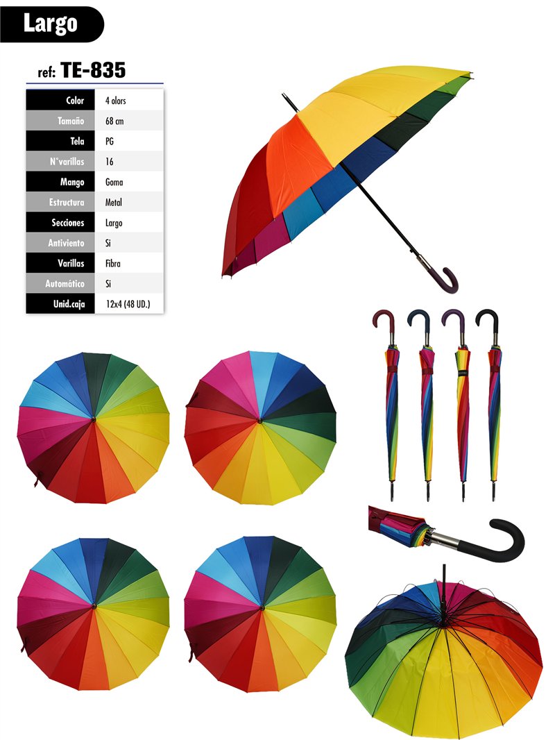 Parapluie long automatique avec des panneaux multicolores de type arc-en-ciel. 16 baleines en fibre et structure métallique anti-vent, poignée en caoutchouc et tissu PG.