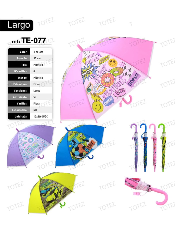 Parapluie long pour enfants à ouverture manuelle avec des panneaux de couleur et des motifs de bande dessinée. Baleines en fibre et structure en fibre avec système anti-vent. Poignée en plastique en forme de crochet.