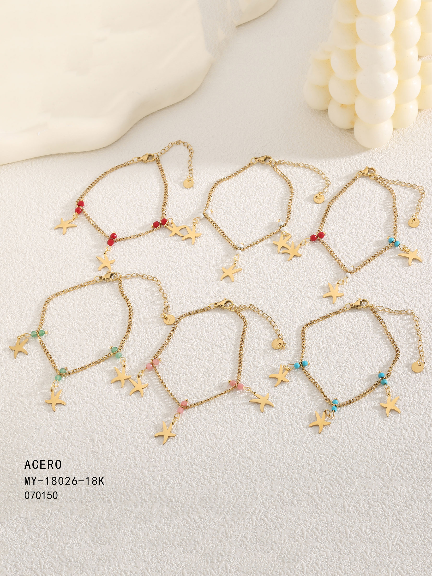 Bracelet perles de résine charme étoiles de mer. Acier inoxydable. Couleurs assorties.