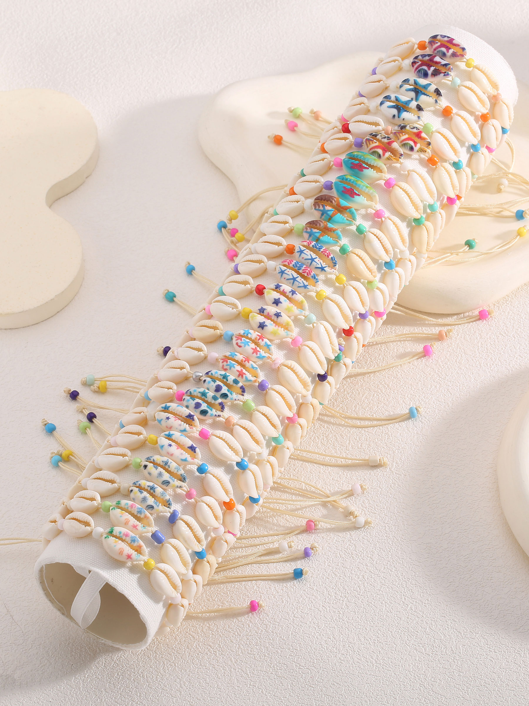 Lot de 24 bracelets réglables coquillages effet naturel avec présentoir.