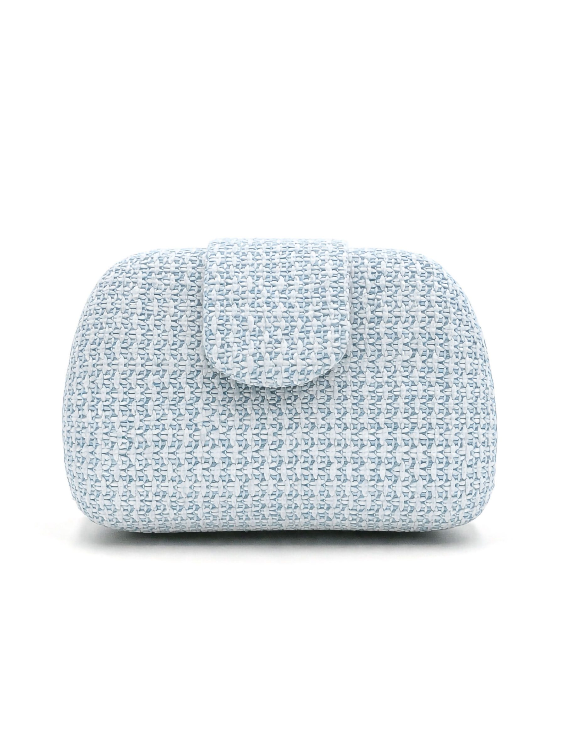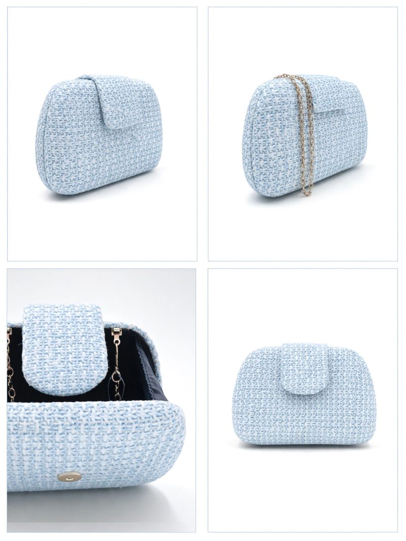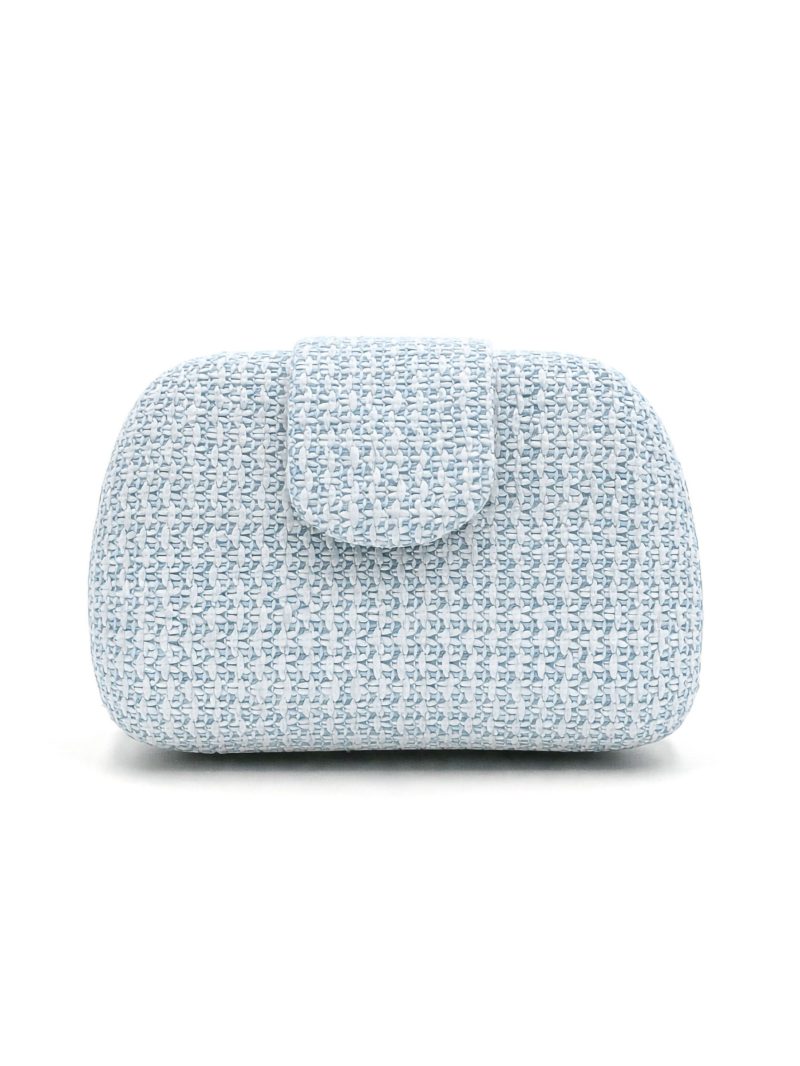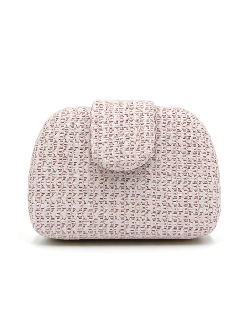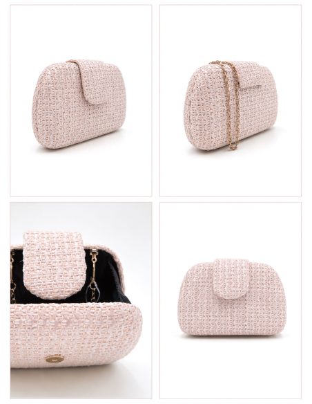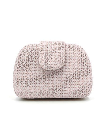 Pochette de soirée. Tissu tressé aux tons naturels. Structure rigide. Détail rabat sur le devant.