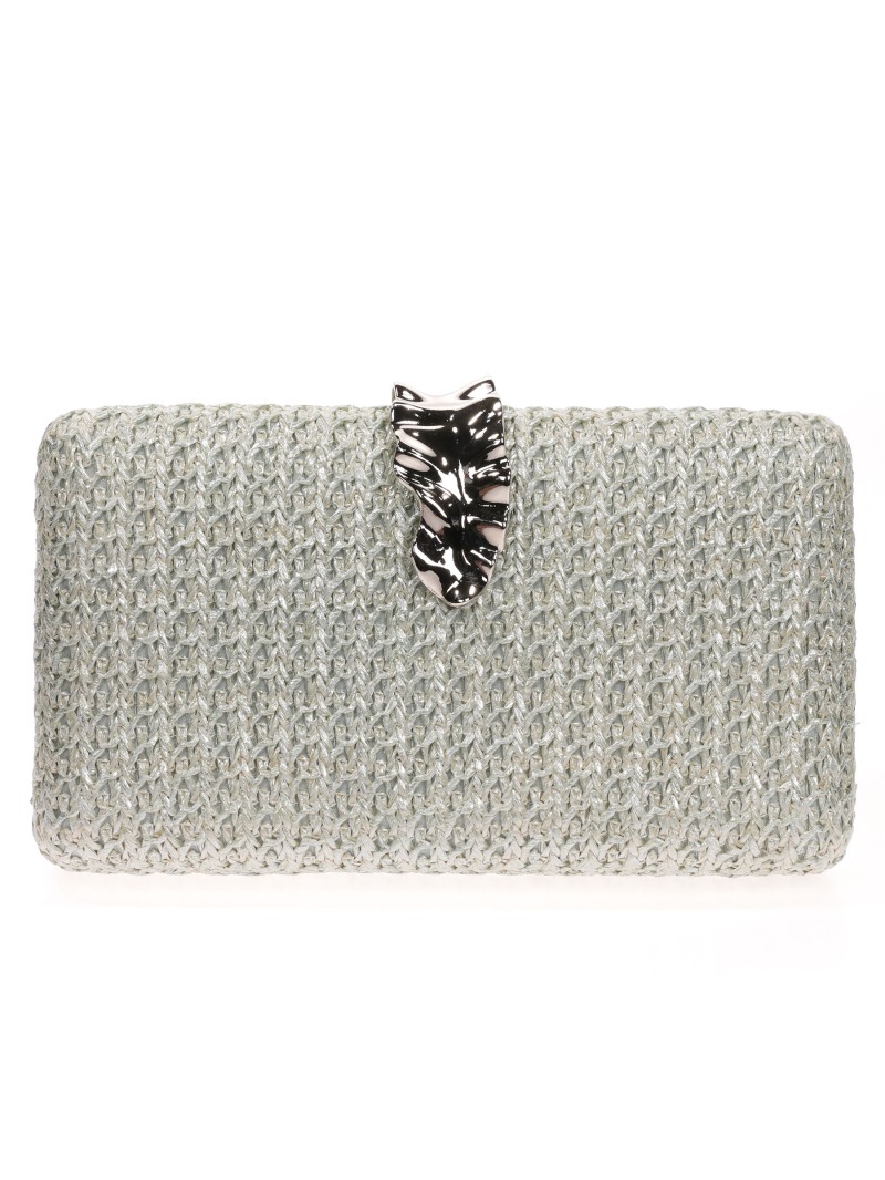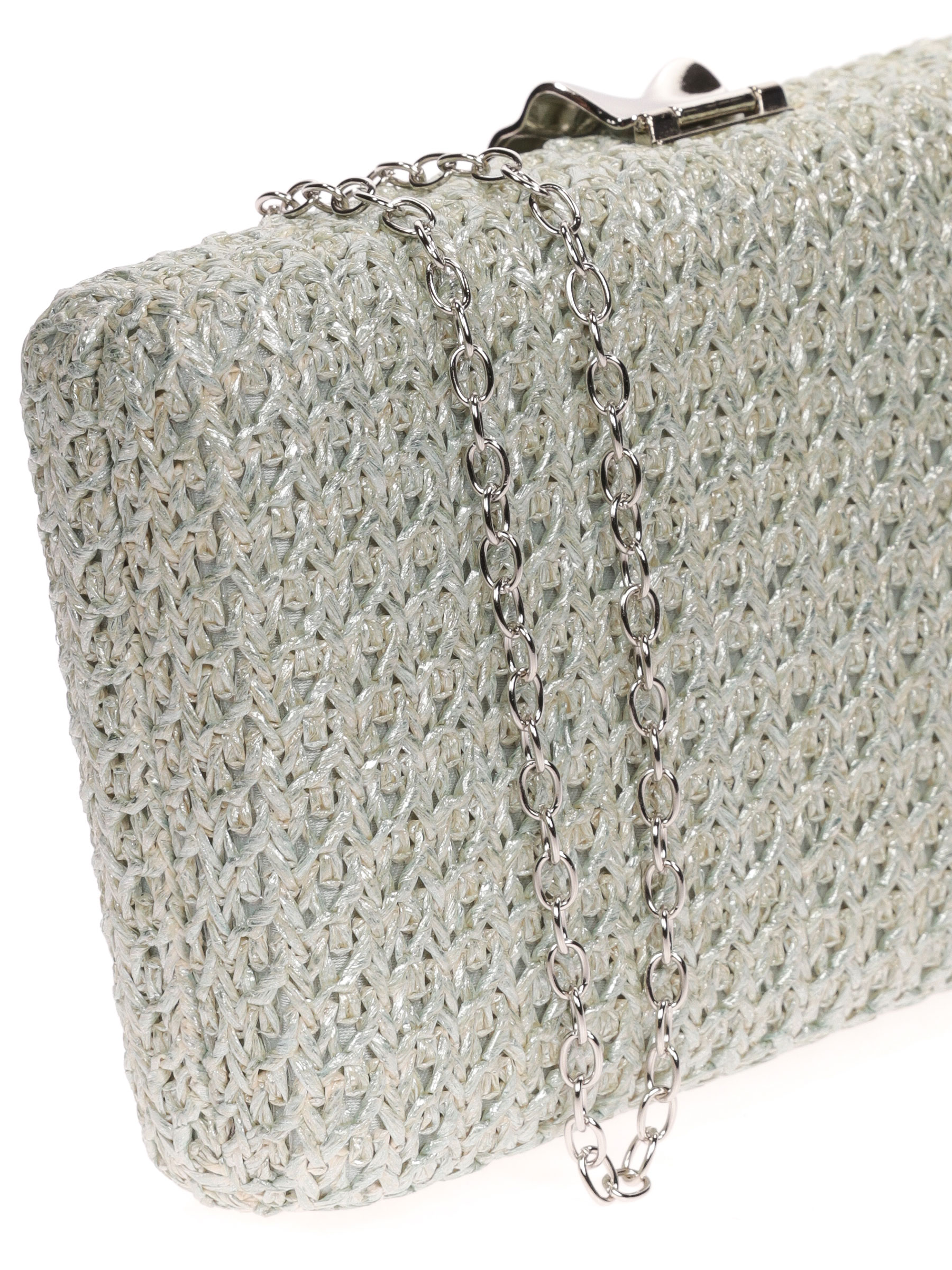Sac de soirée. Matériau en raphia. Détail de quincaillerie argentée avec pierres. Anse d'épaule en chaîne. Doublure sans poche intérieure. Fermeture métallique avec feuille argentée.