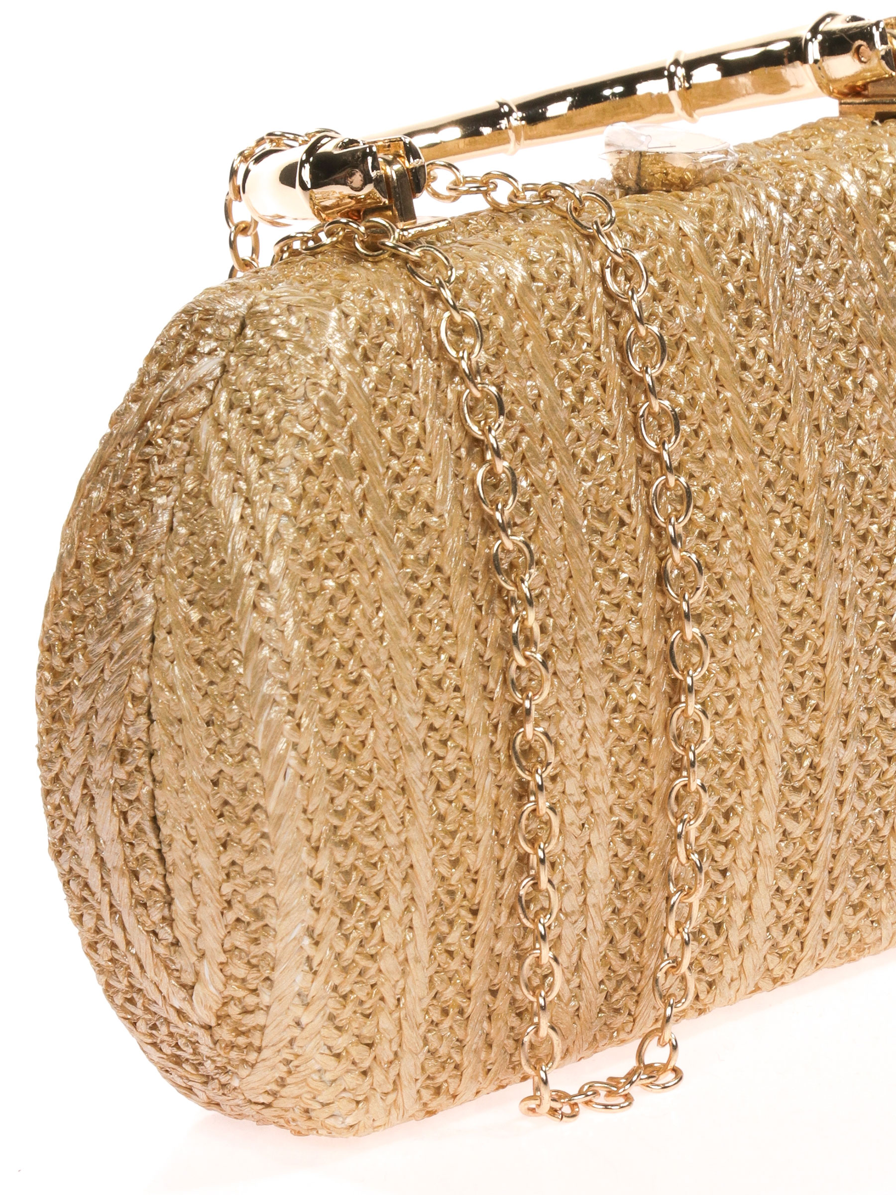Bolso de soirée. Effet raphia. Effet métallisé. Anse à main. Anse d'épaule en chaîne. Doublure sans poche intérieure. Fermeture métallique dorée.