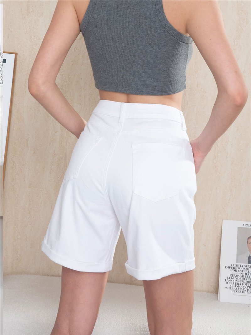 Bermuda en denim blanc. Cinq poches. Ourlet retroussé. Fermeture éclair et bouton métallique sur le devant. Hauteur de taille : 28 cm. Longueur : 43 cm.