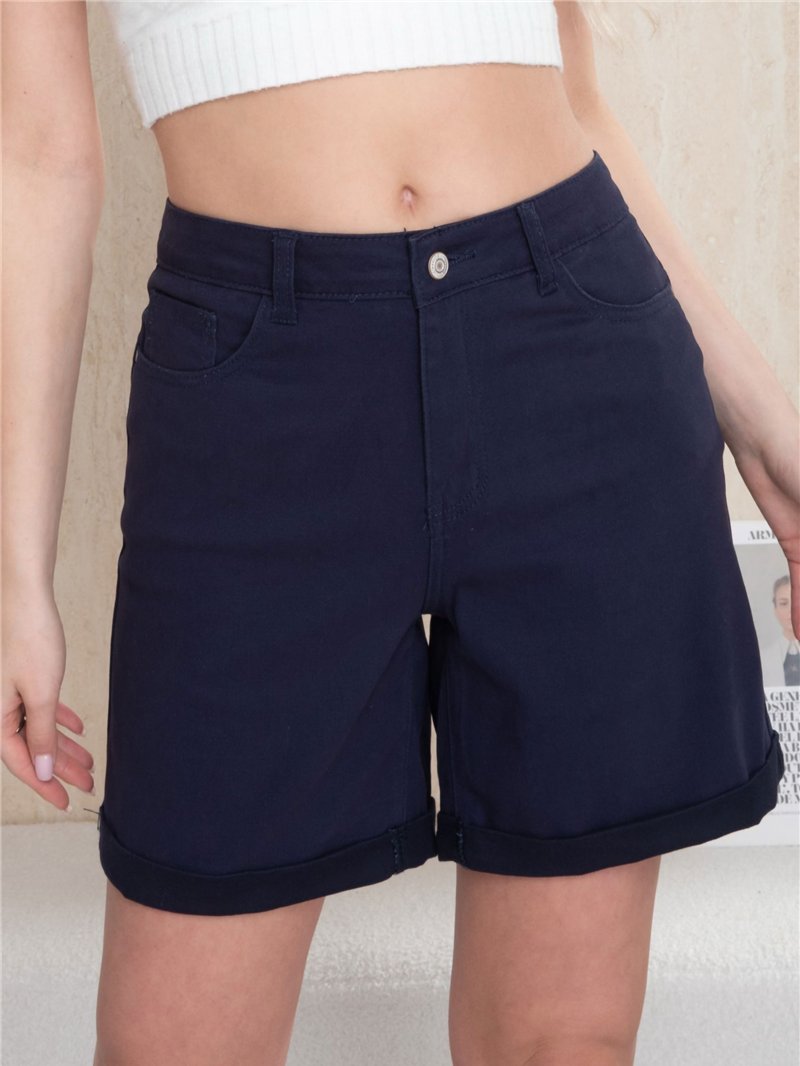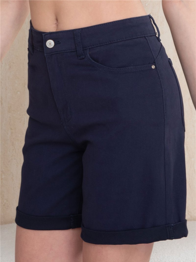 Bermuda en denim bleu marine. Cinq poches. Ourlet retroussé. Fermeture éclair et bouton métallique sur le devant. Hauteur de taille : 28 cm. Longueur : 43 cm.