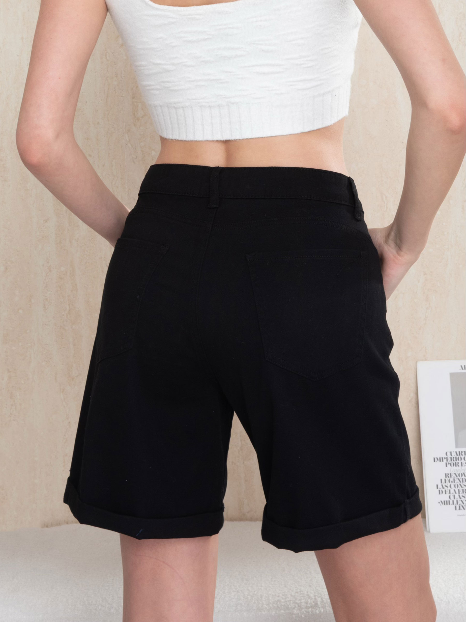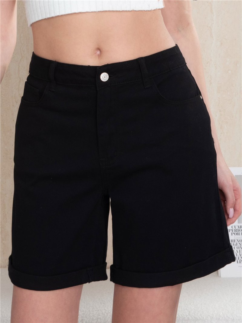 Bermuda en denim noir. Cinq poches. Ourlet retroussé. Fermeture éclair et bouton métallique sur le devant. Hauteur de taille : 28 cm. Longueur : 43 cm.