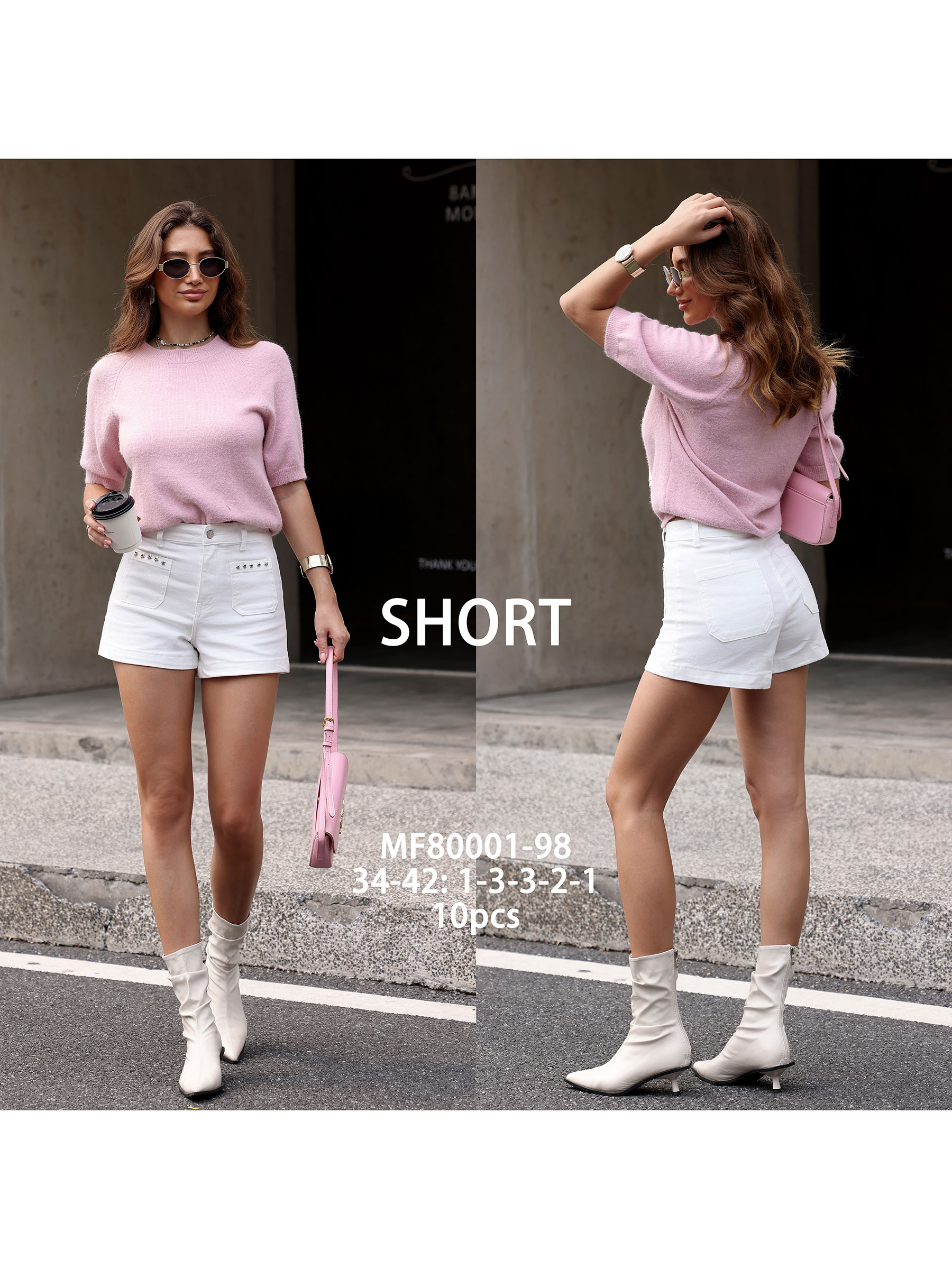 Short en jean blanc taille haute avec poches avant ornées de clous en forme d'étoile.