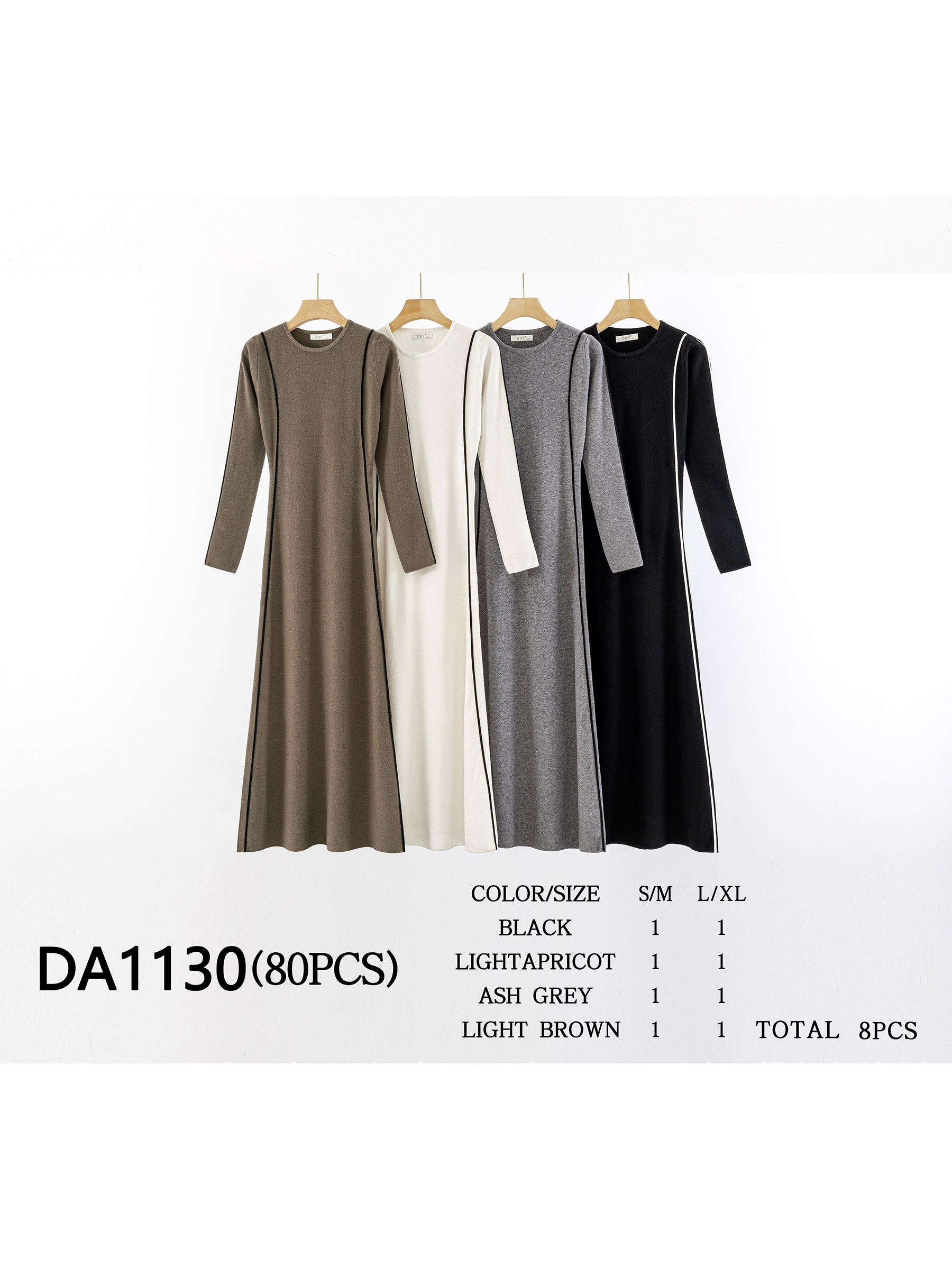 Robe longue en contraste de tricot. Col rond. Manches longues.