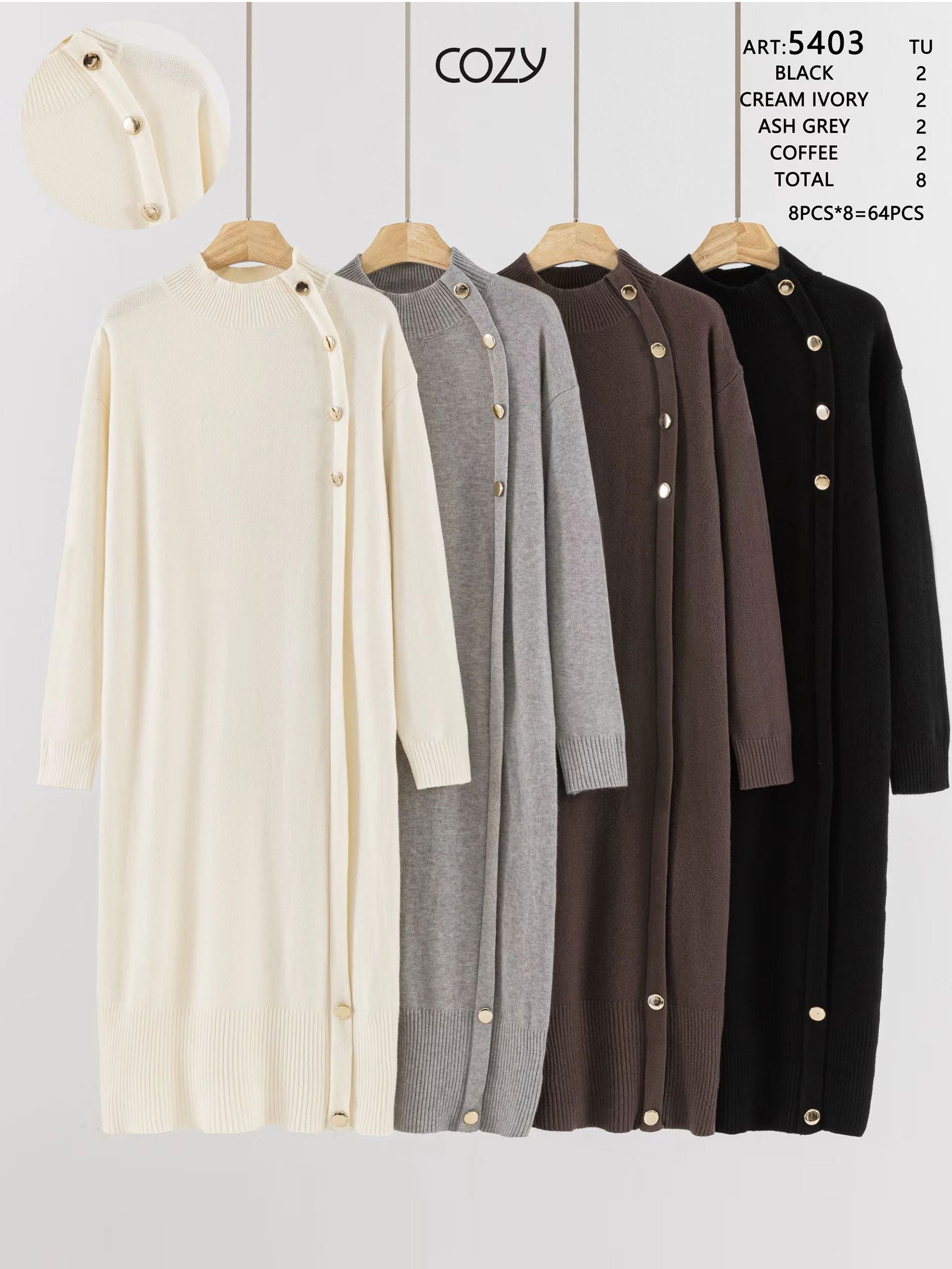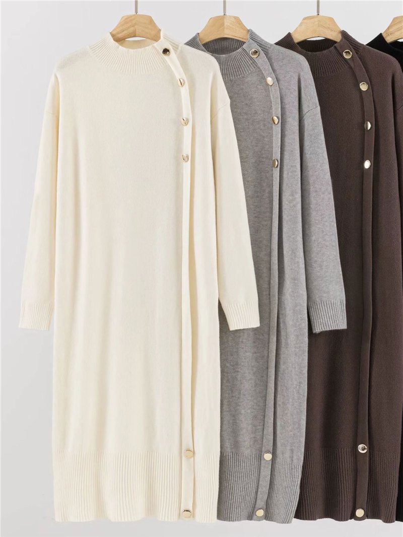 Robe en maille douce. Détail boutons. Col perkins. Manches longues.