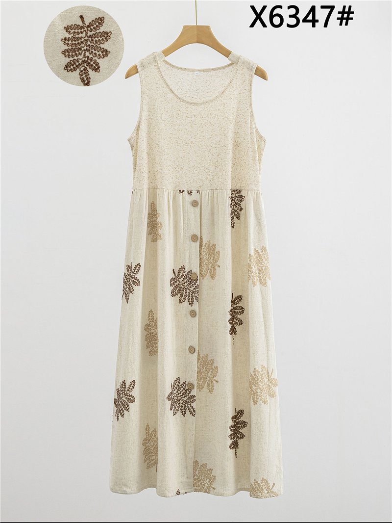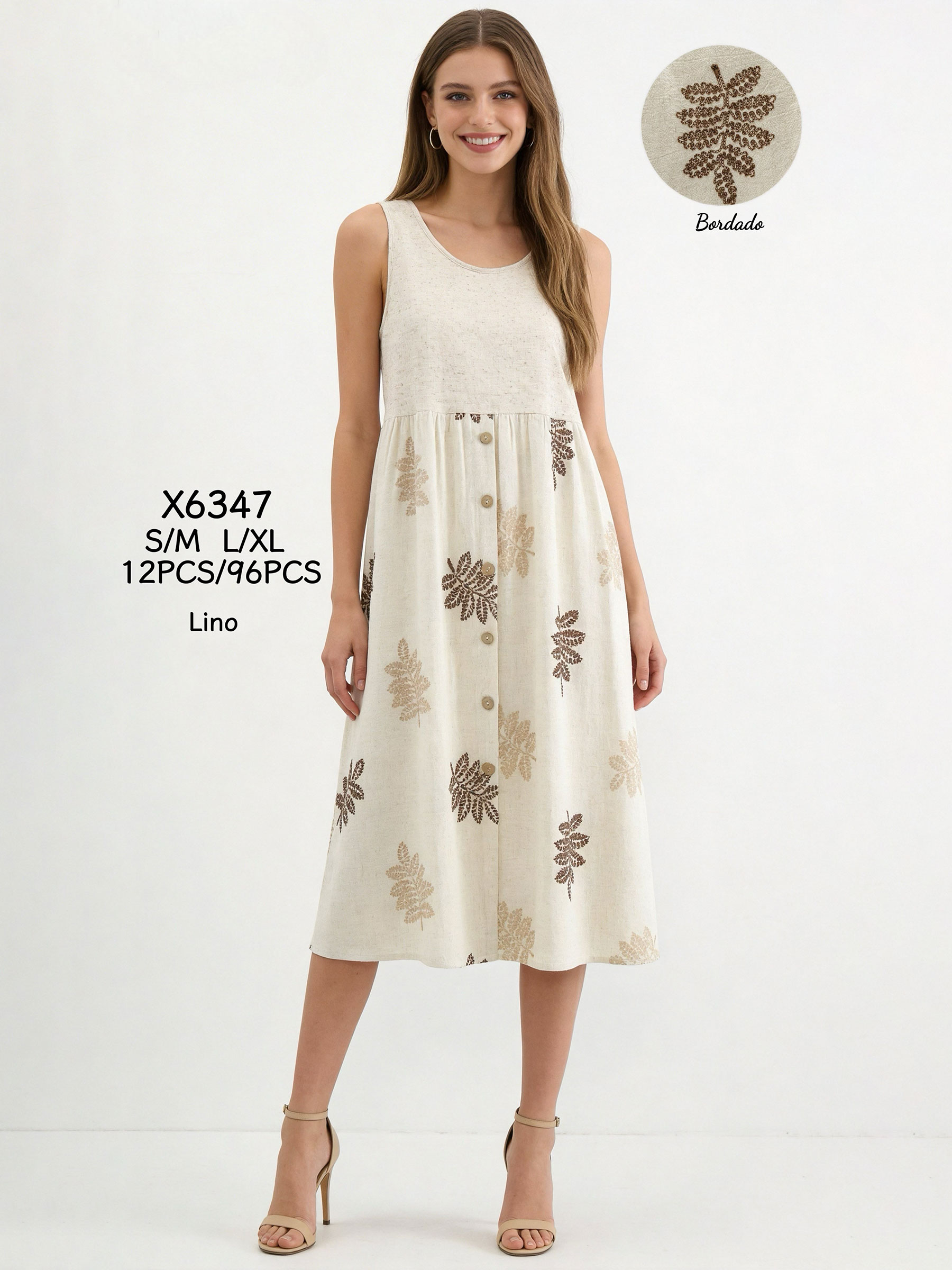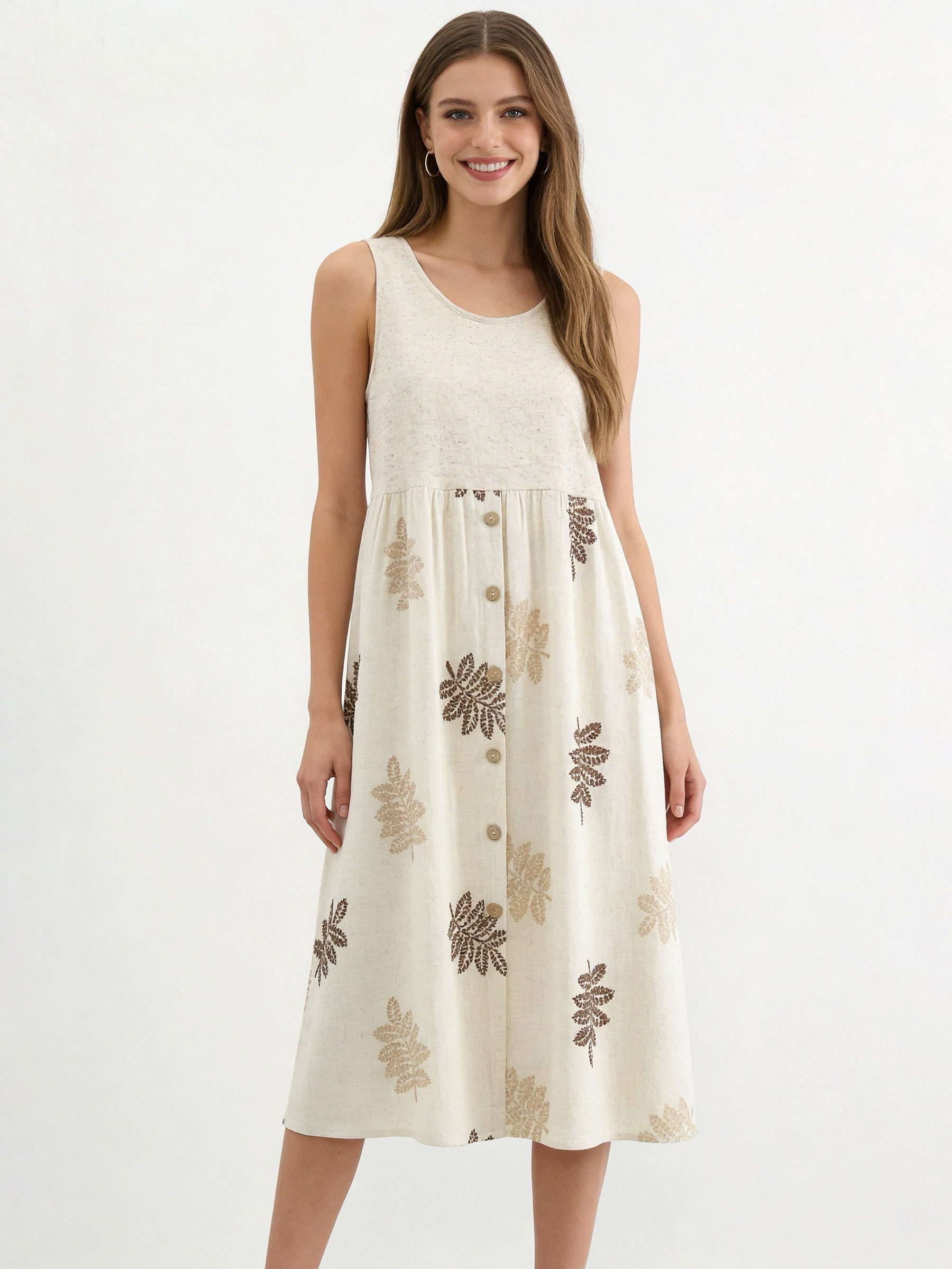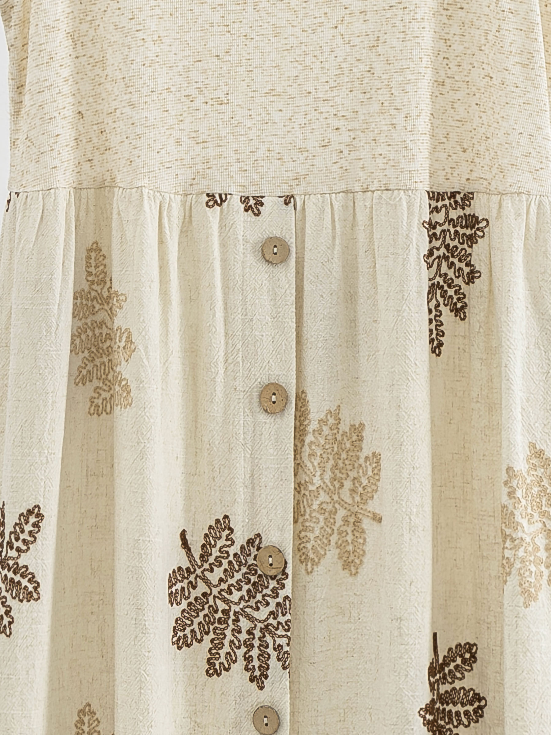 Robe midi. Encolure ronde. Sans manches. Boutonnage décoratif sur le devant. Broderie de feuilles bicolore. Tissu effet lin.