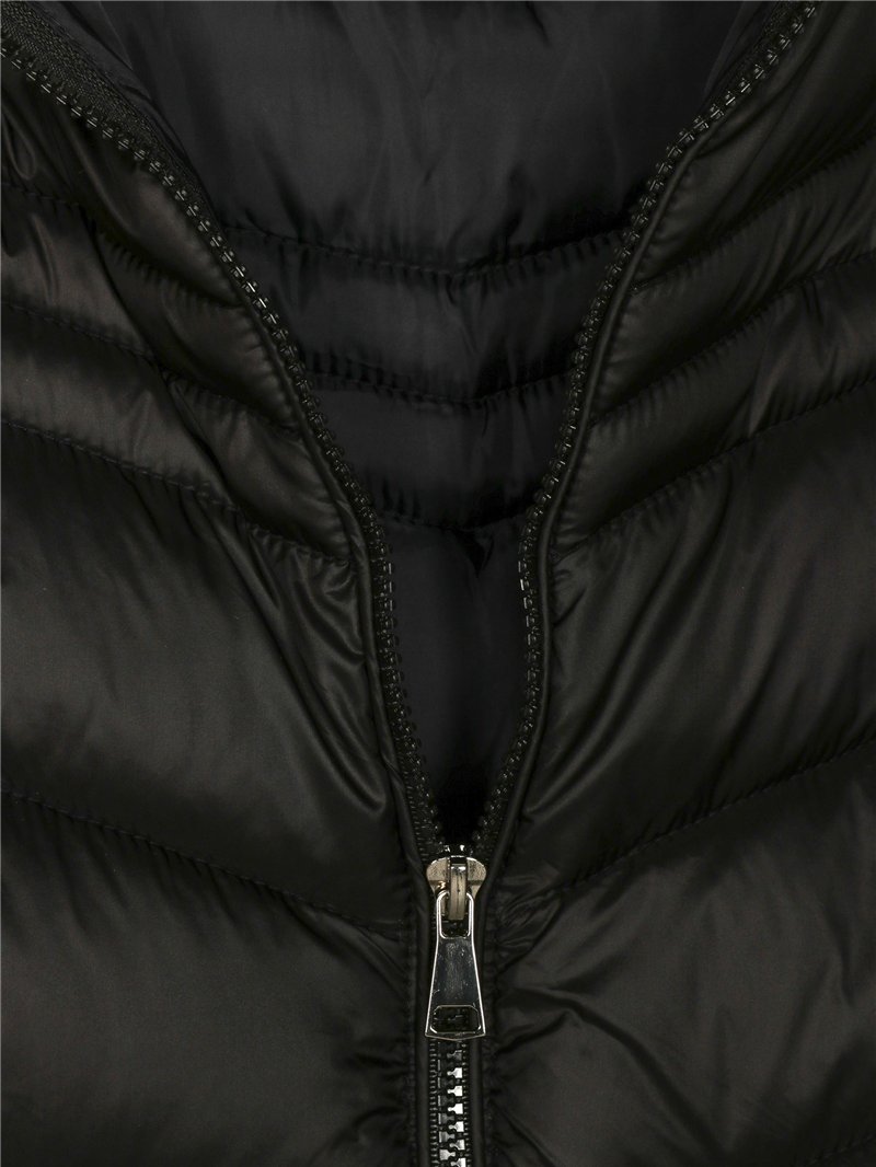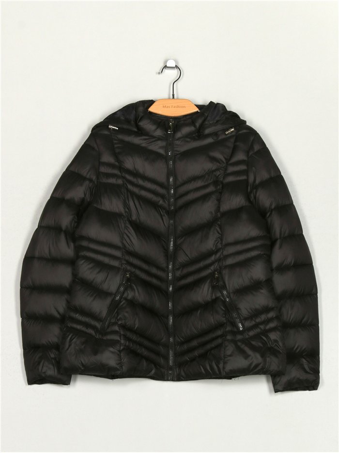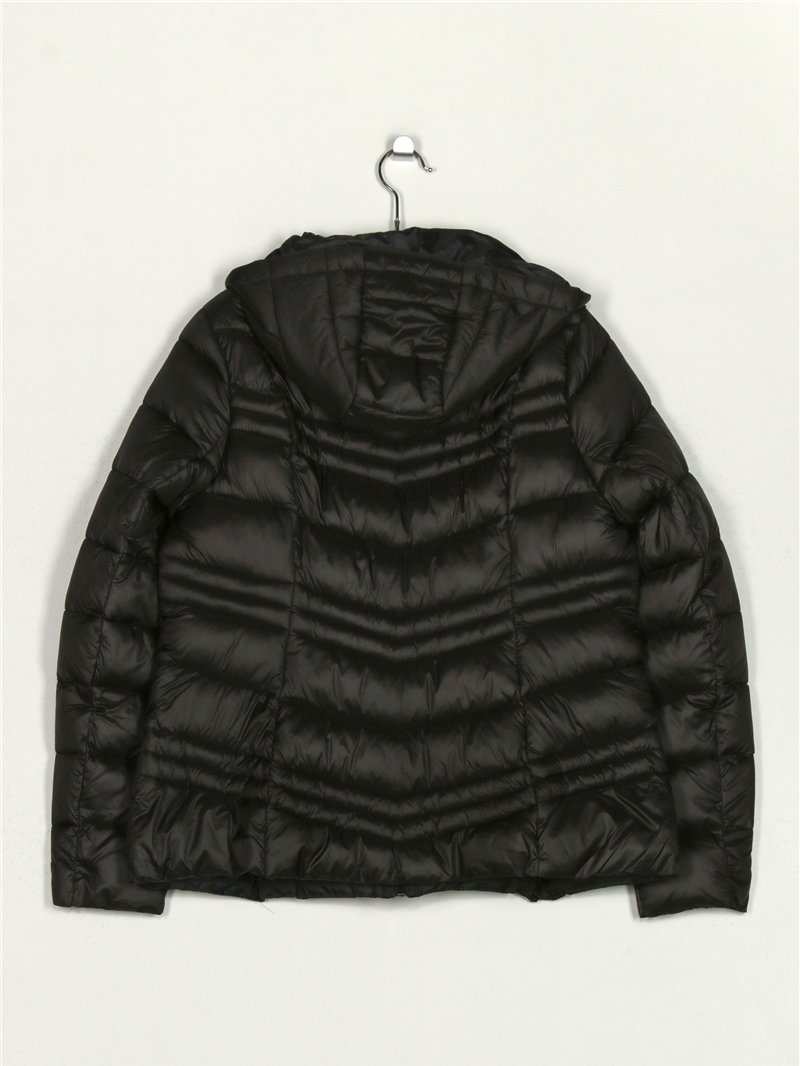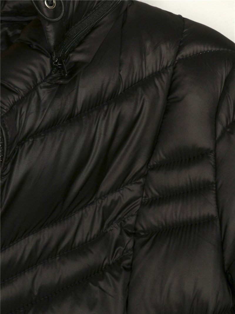 Giacca corta metallizzata. Imbottita. Cappuccio removibile. Tasche laterali con zip. Collo alto. Chiusura centrale con zip. Manica lunga.