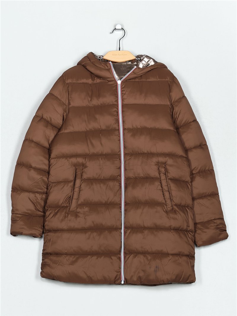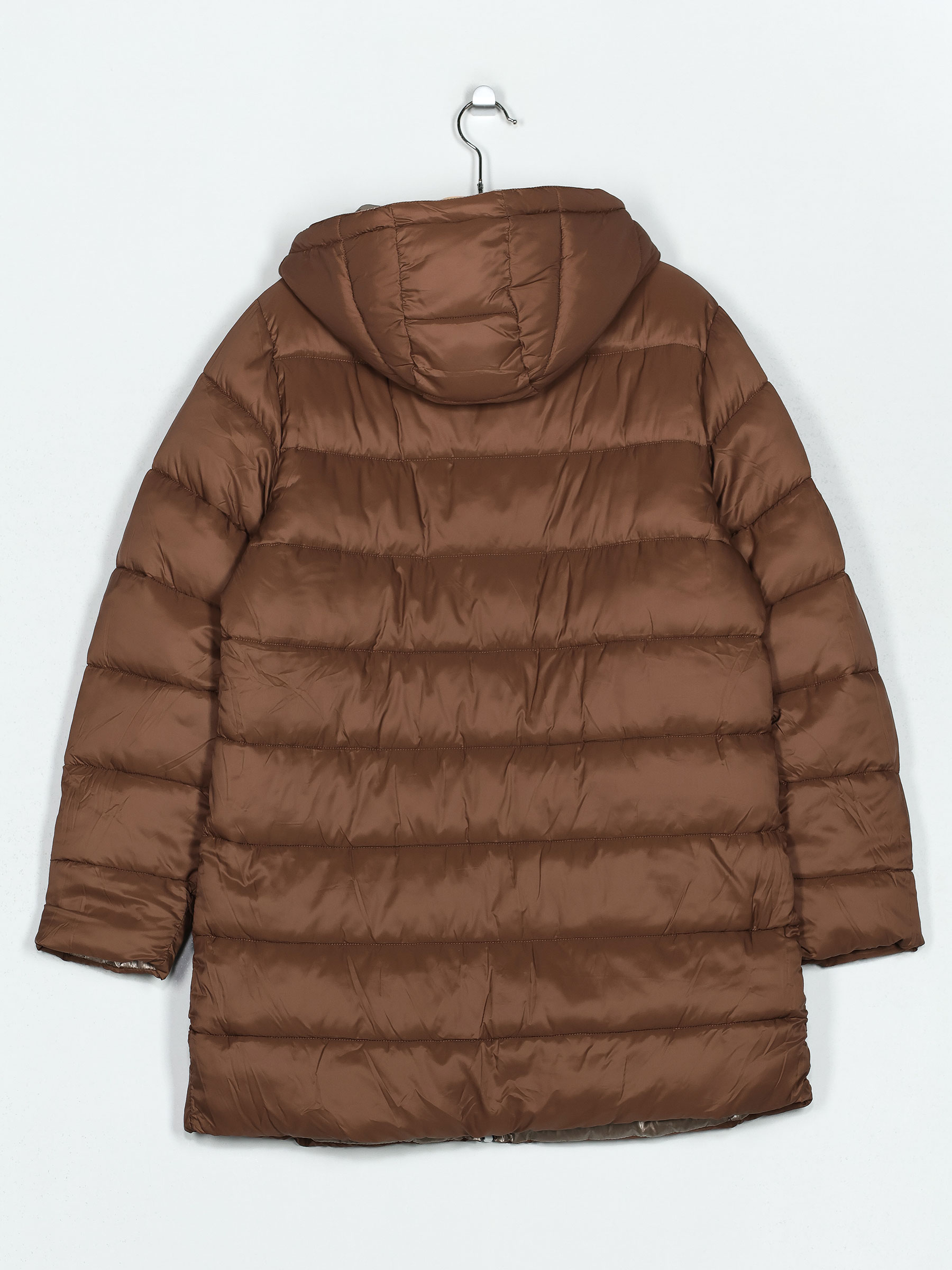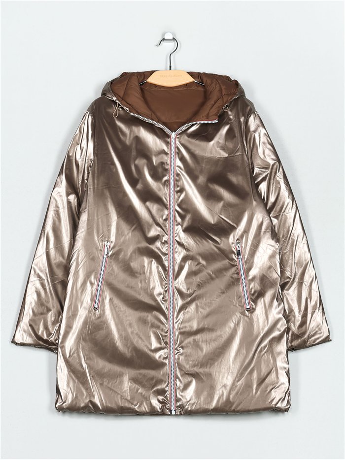 Anorak metallico lungo sopra il ginocchio. Reversibile. Cappuccio non removibile. Tasche laterali. Manica lunga. Chiusura centrale con zip.