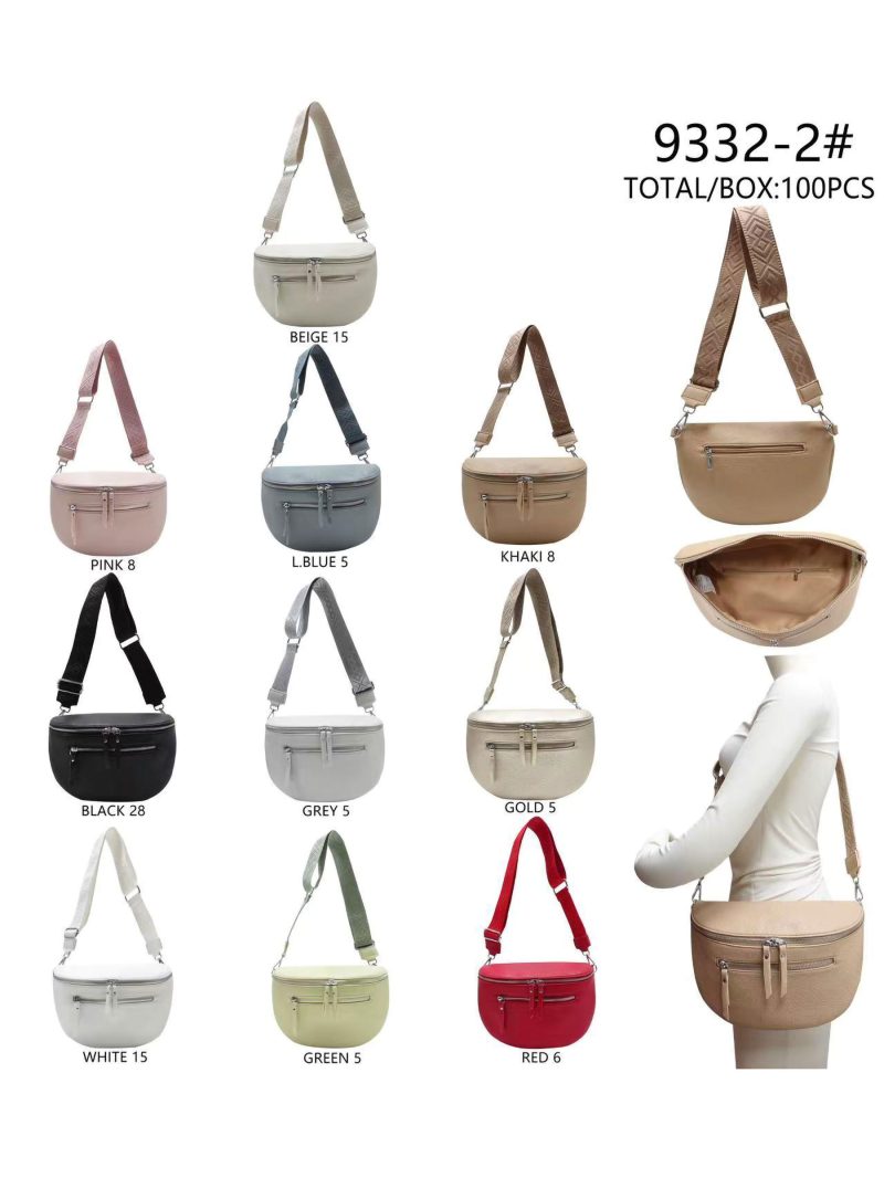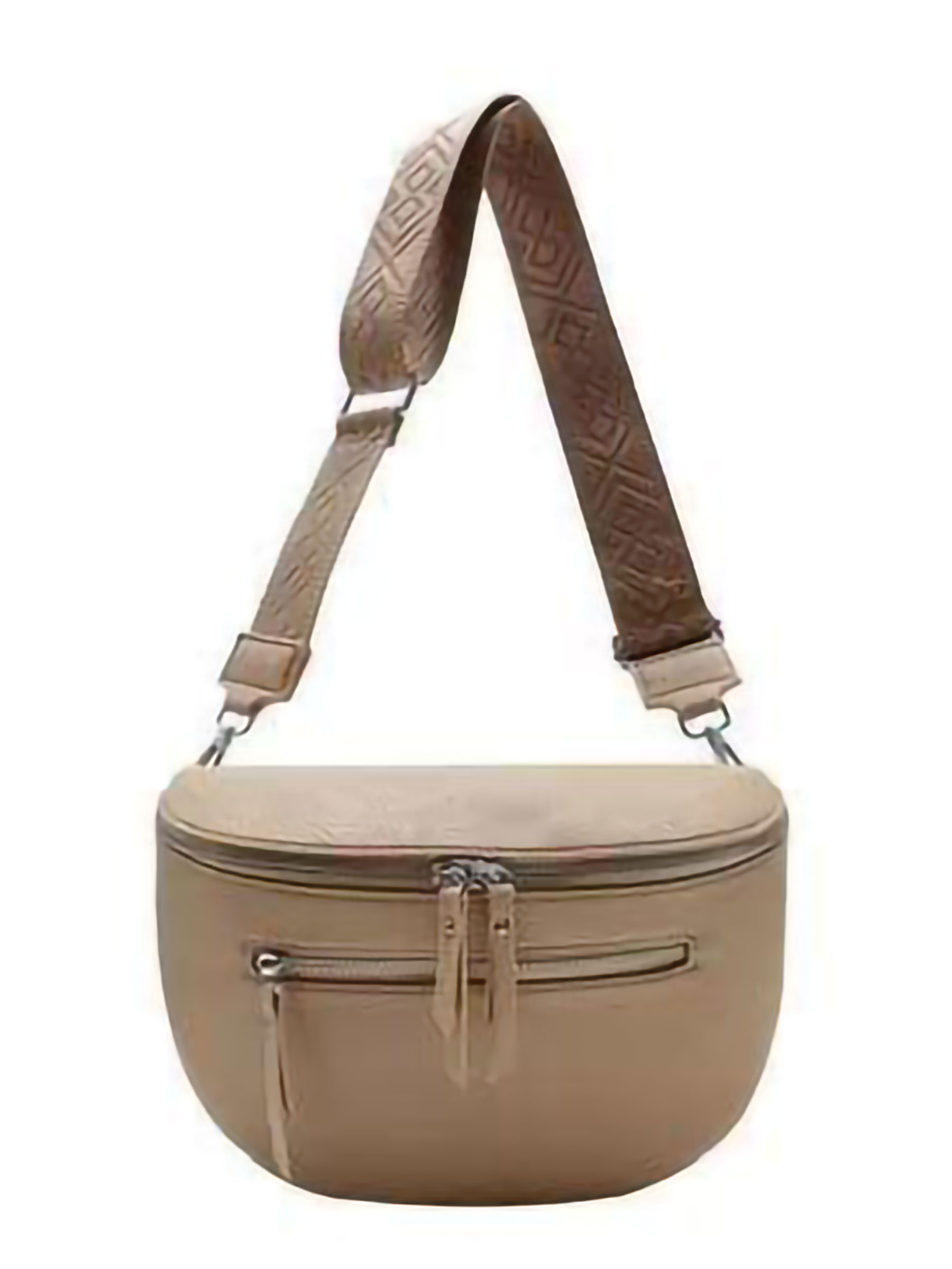 Borsa a tracolla con doppia cerniera e tracolla regolabile.