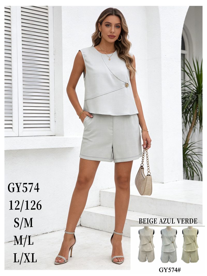 Completo con camicetta senza maniche, bottone a fiore e pantaloncini.