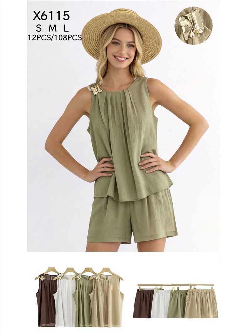 Completo composto da top plissettato con dettagli gioiello e shorts.