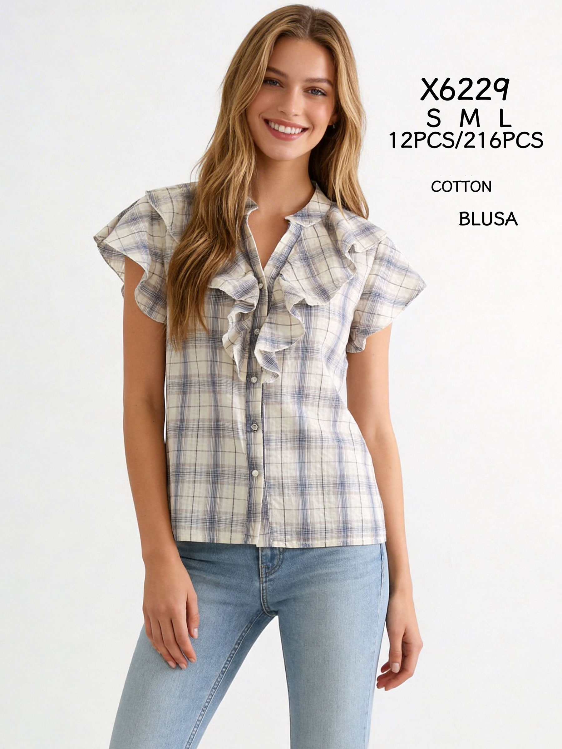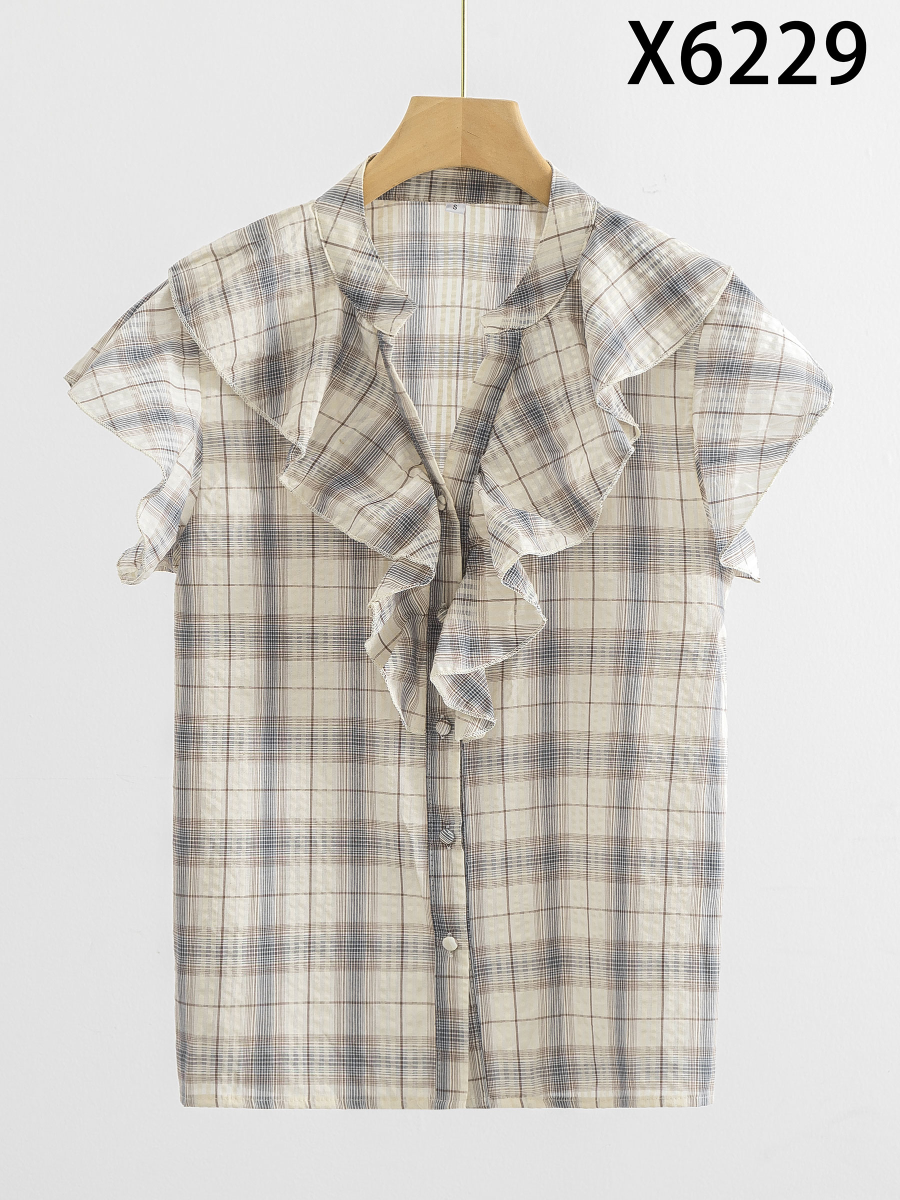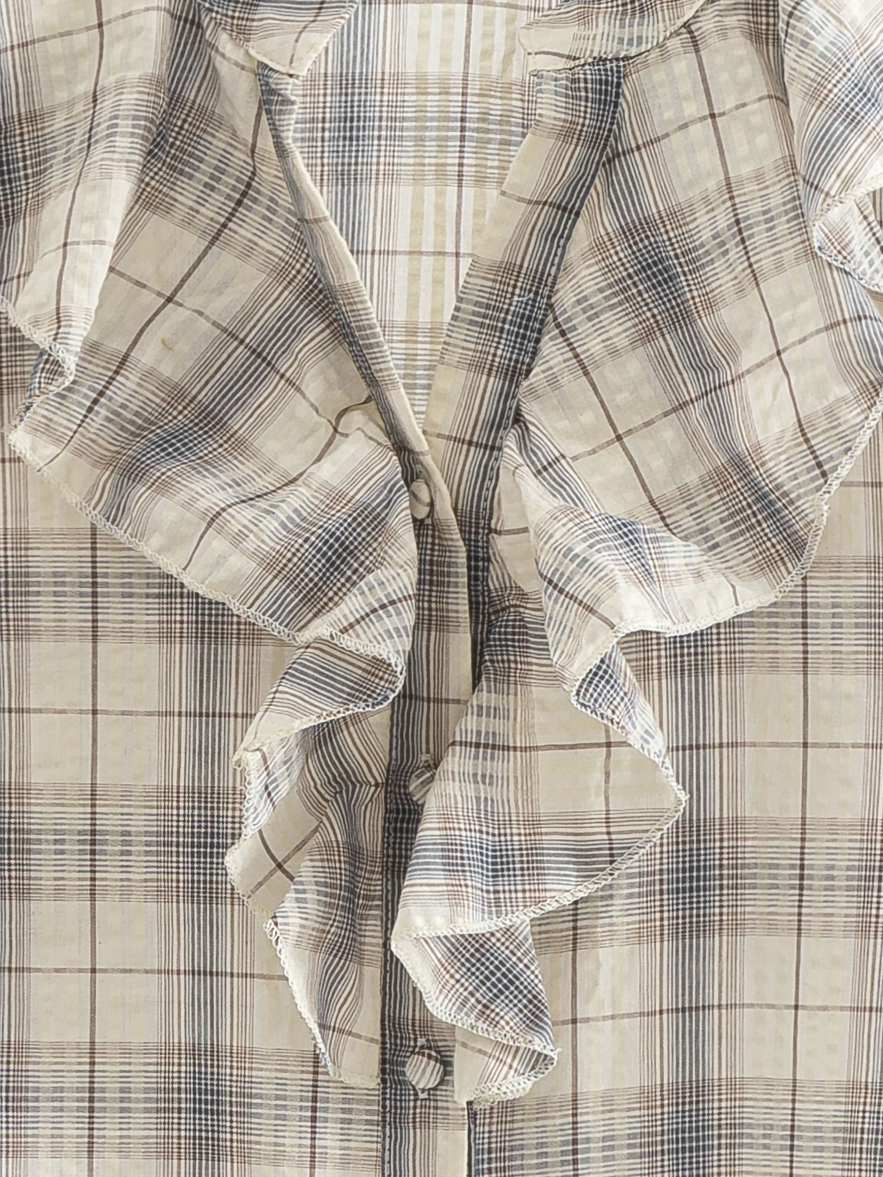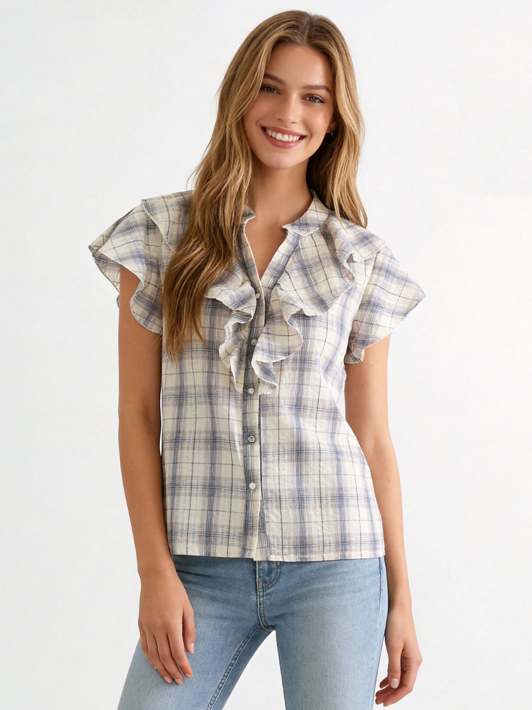 Camicetta a quadri in cotone con volant sul davanti e maniche corte svasate.