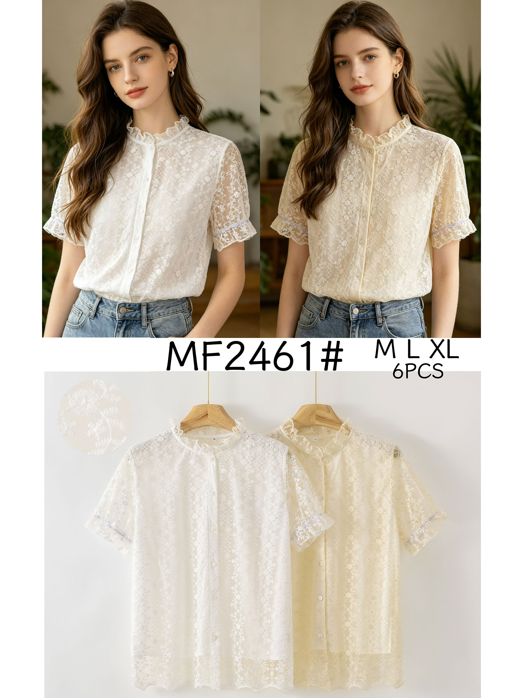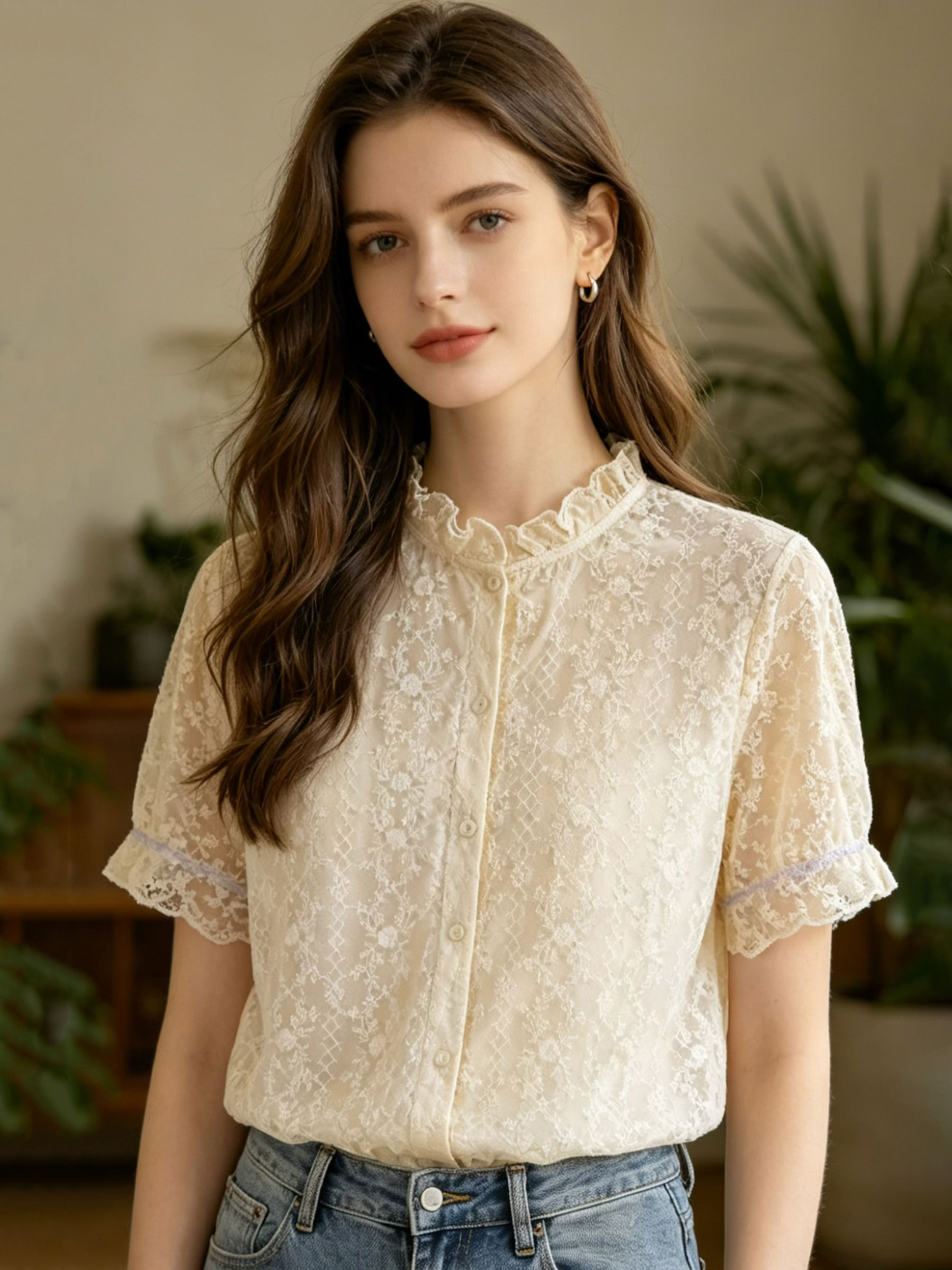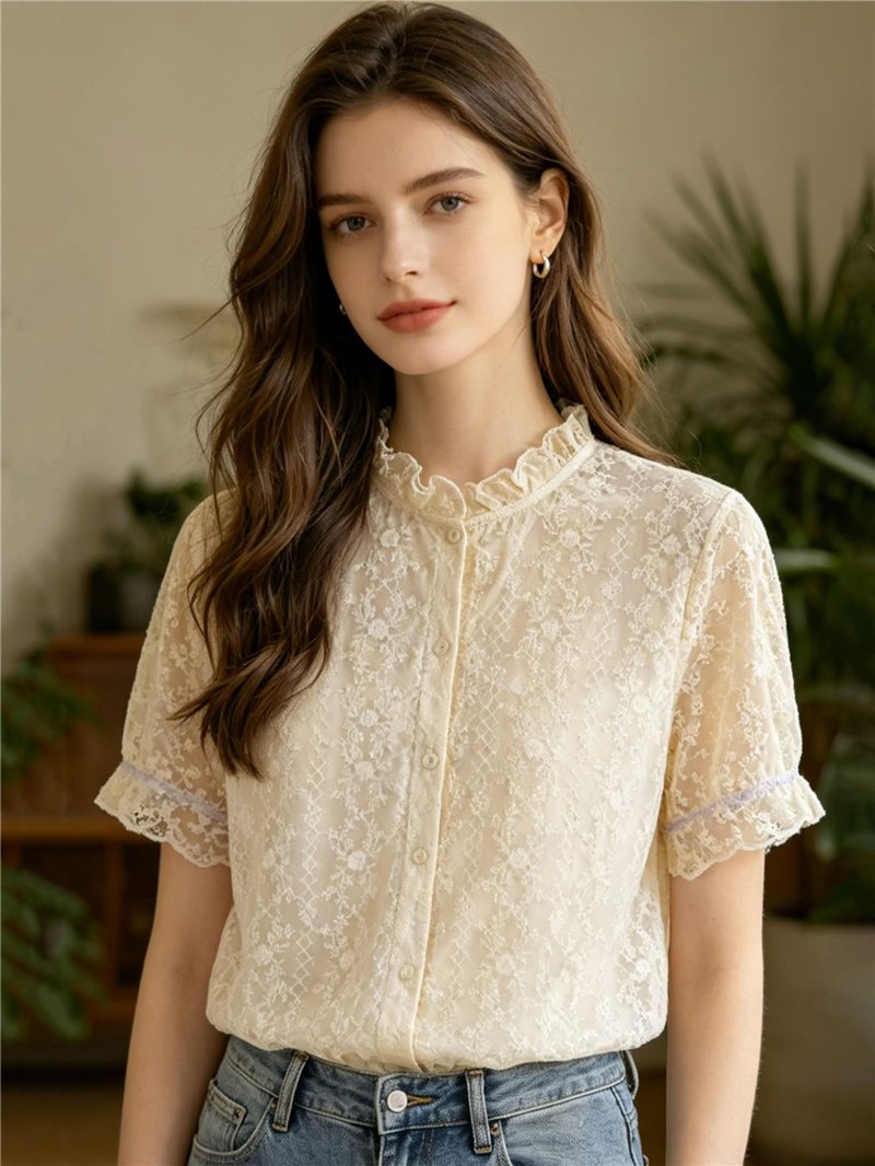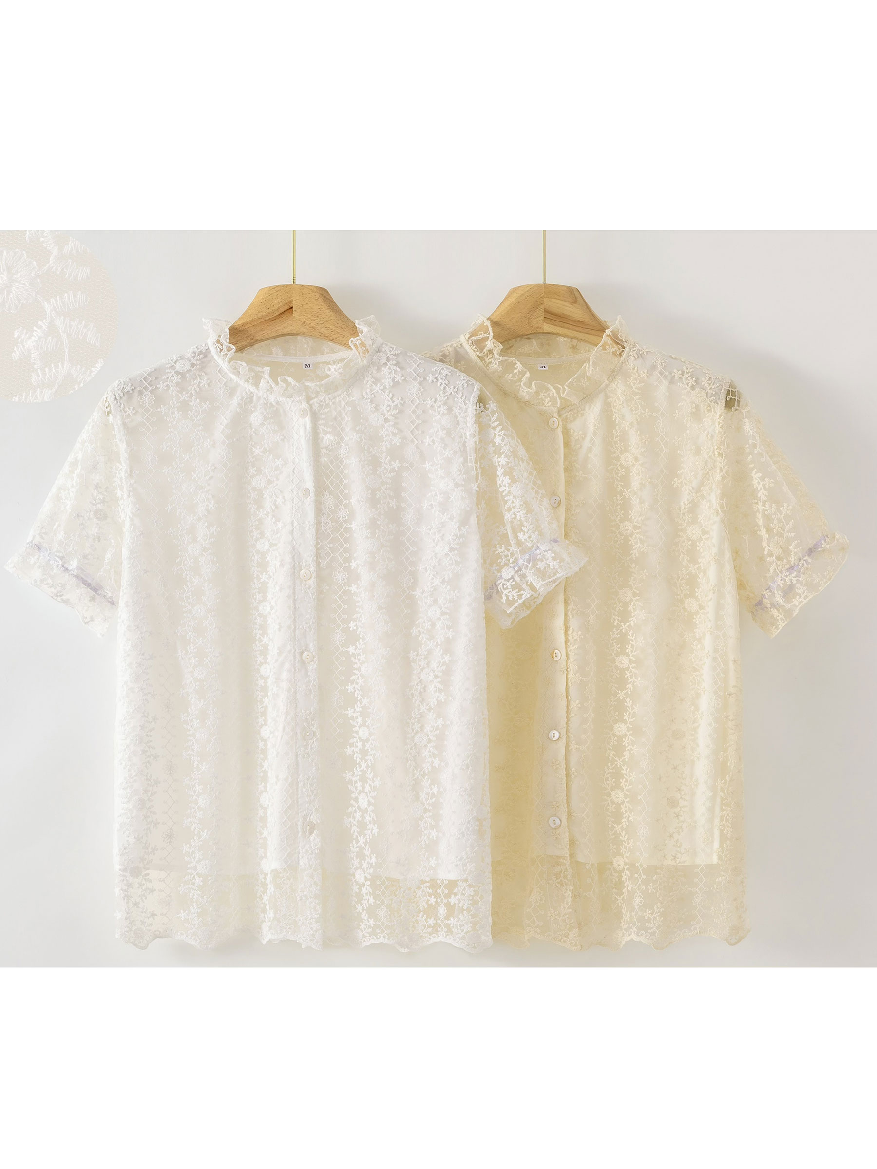 Camicetta in pizzo floreale. Collo alto con volant. Maniche corte. Chiusura frontale con bottoni. Leggermente trasparente. Stile romantico.